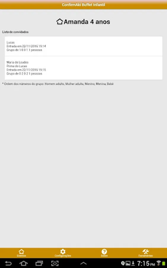 With the remodeling and new version of ConfirmAki Children's Buffet you create an event with the values defined for each guest band (adult man, adult woman, boy, girl and baby). At the time of the event you register the entry of each group of guests indicating the amount of people in each group. No need to have a prior list of invitees to the event.