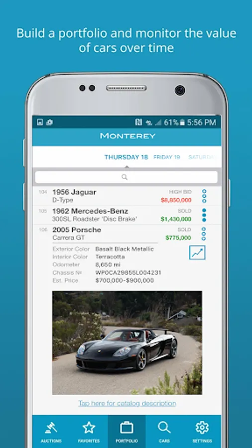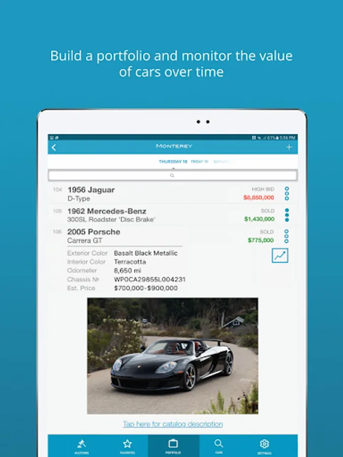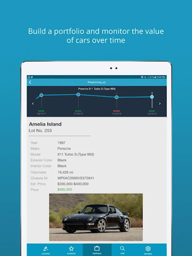 Put together a group of cars you want to track over time. Your Portfolio will chart matching results and email you an update when cars on your list sell at auction.