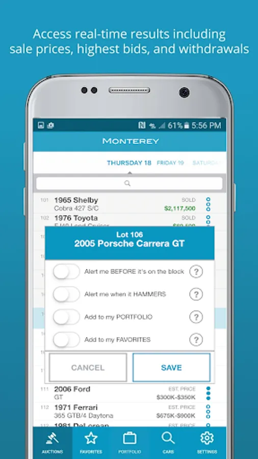 Choose the sales you want to follow and add them to your Auctions list. Interested in seeing how a particular car does? Add it to your Favorites for quick reference. Opt for an alert and you’ll get notified before your car crosses the block or when it hammers.