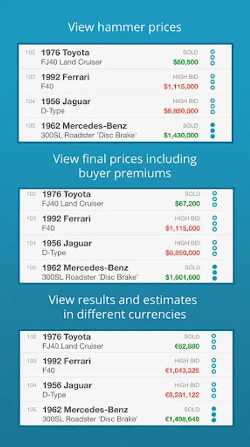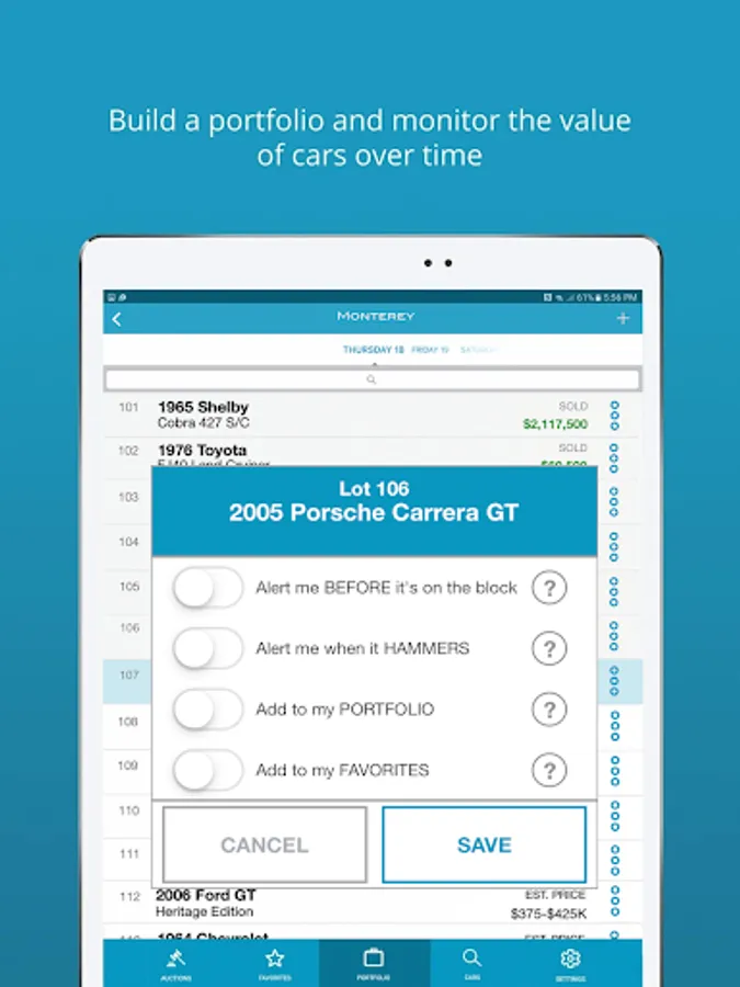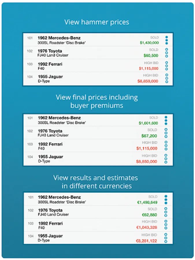 Hammer Price is the original collector car auction app that lets you follow all of your favorite sales at once, in real-time. Preview auction runlists, keep track of interesting lots, compare today’s prices with past results, and see what’s selling now.