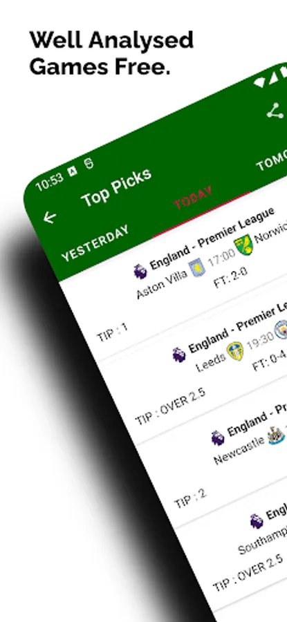 The match tips offered in the app include.