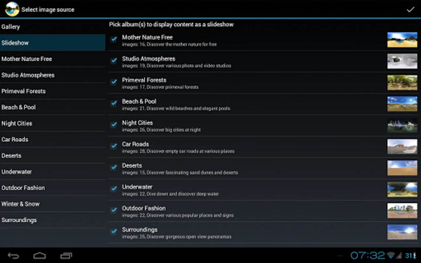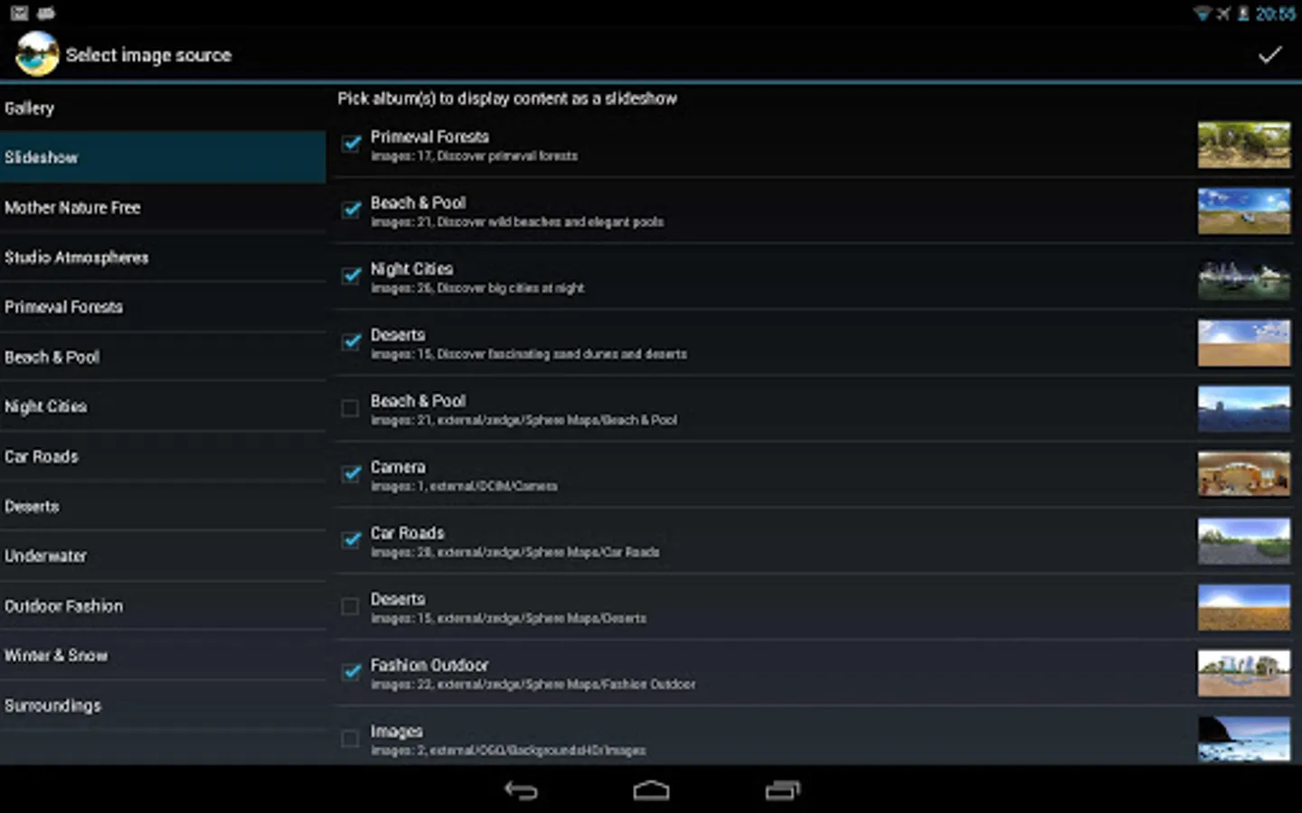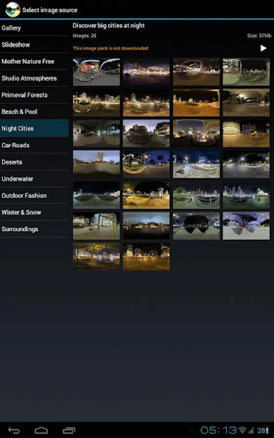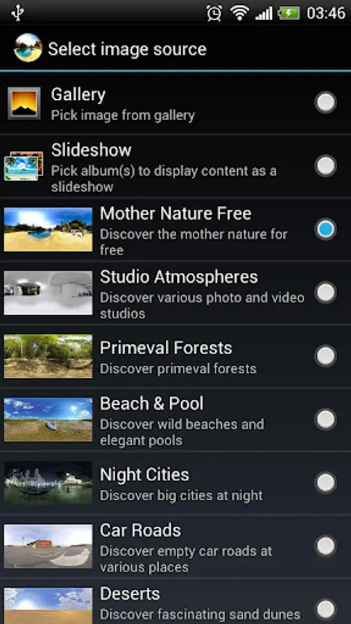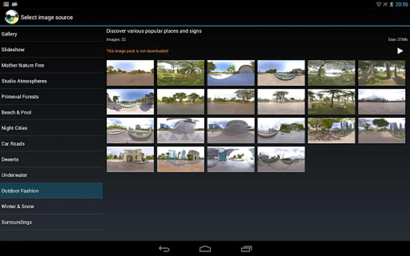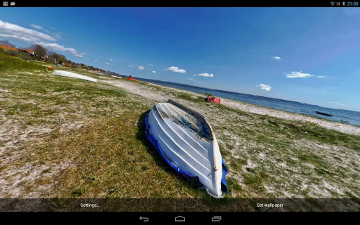 Photosphere HD Live Wallpaper displays spherical photos as your current wallpaper on your phone and tablet. You may choose image from gallery or from additional image packs available for purchase. One image pack available for free.