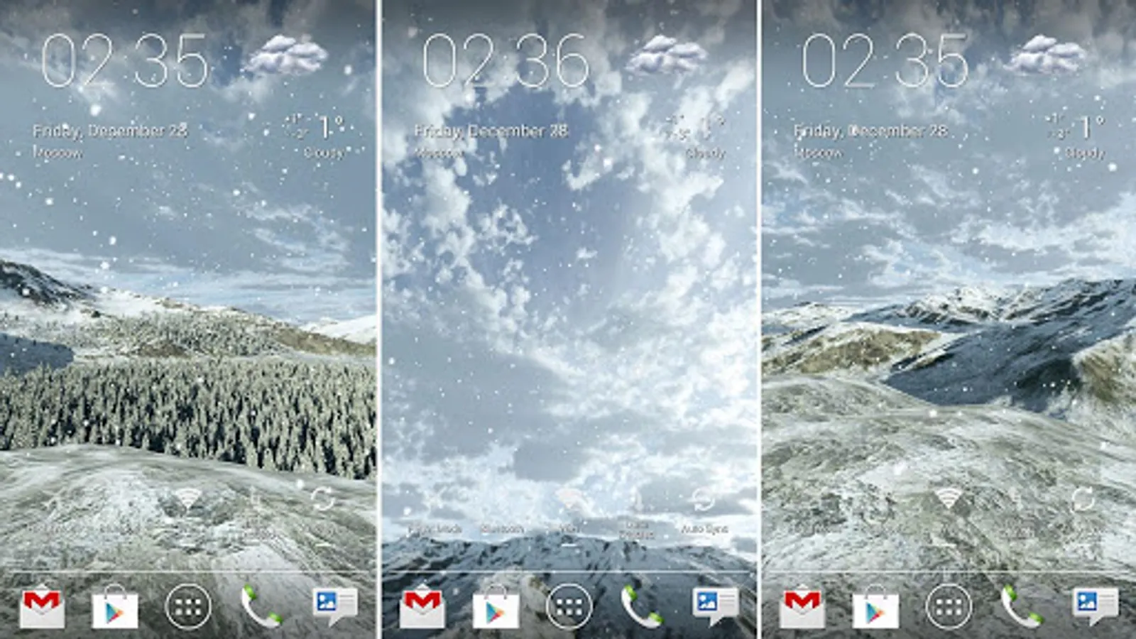 Choose between forest, mountains, hills, rocks, valley or ice alien planet. Relax watching on gently falling snowflakes. Make it light snow or heavy snowfall, daytime or evening (automatic daytime requires Google Location Service to be enabled), windy or calm.