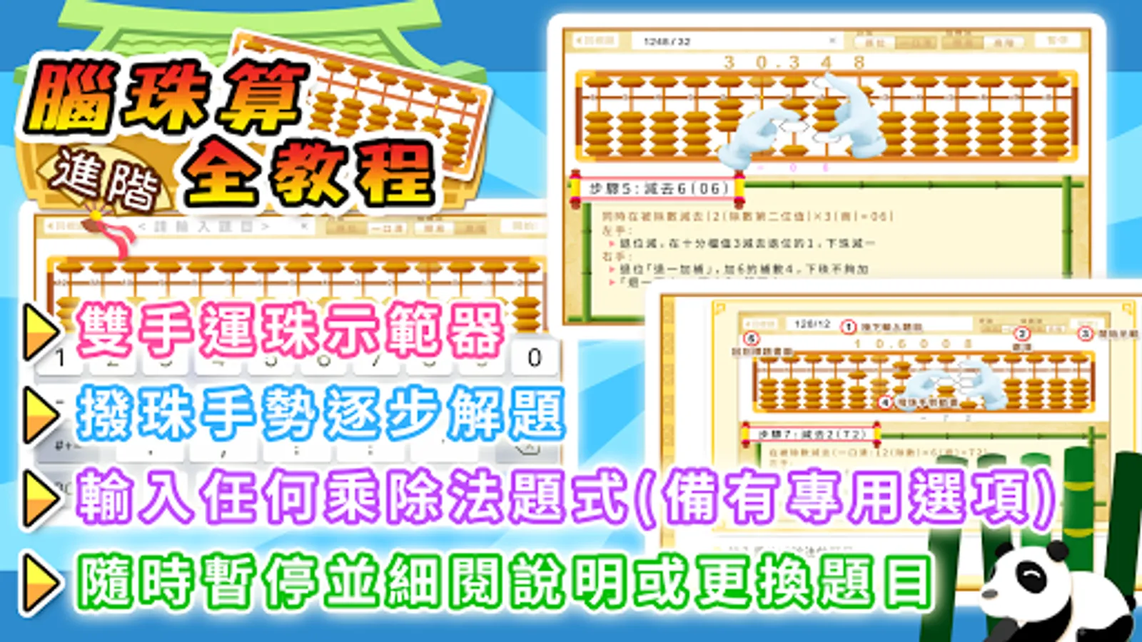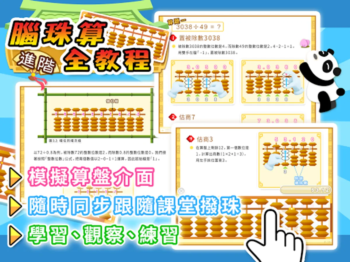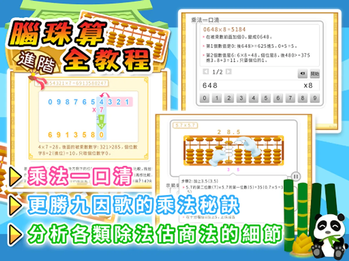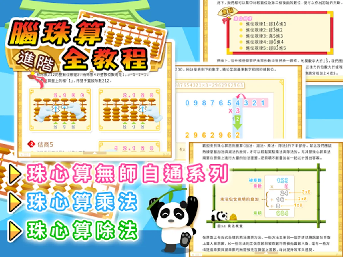 「腦珠算全教程(進階)」集中講解珠心算的乘法與除法, 內容劃分為兩個部分, 分別是互動教程與雙手運珠解題示範器, 配合乘除法專門的選項讓學習更得心應手。