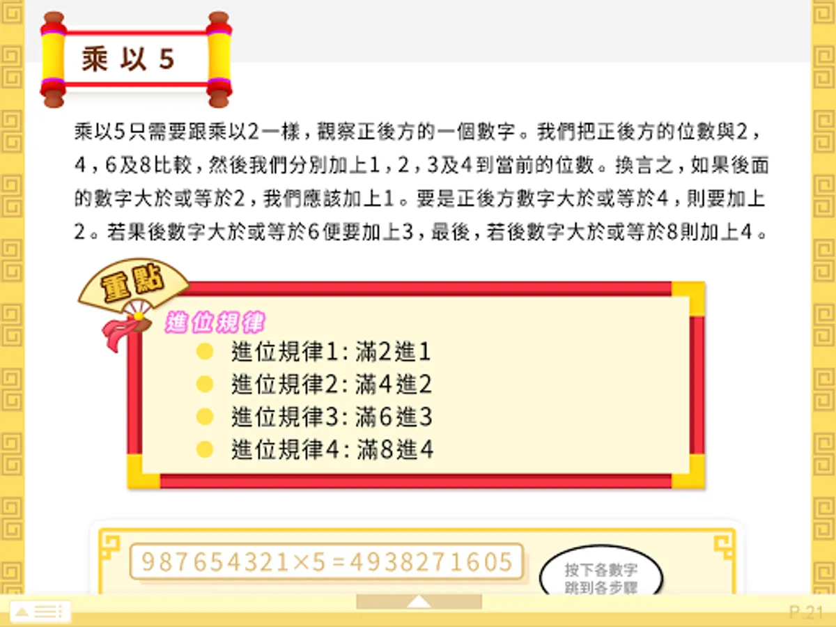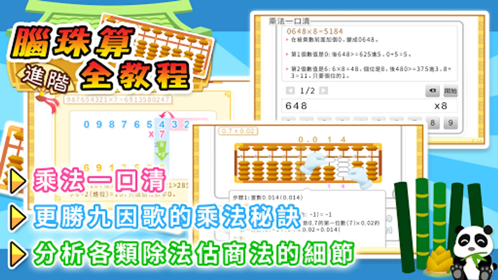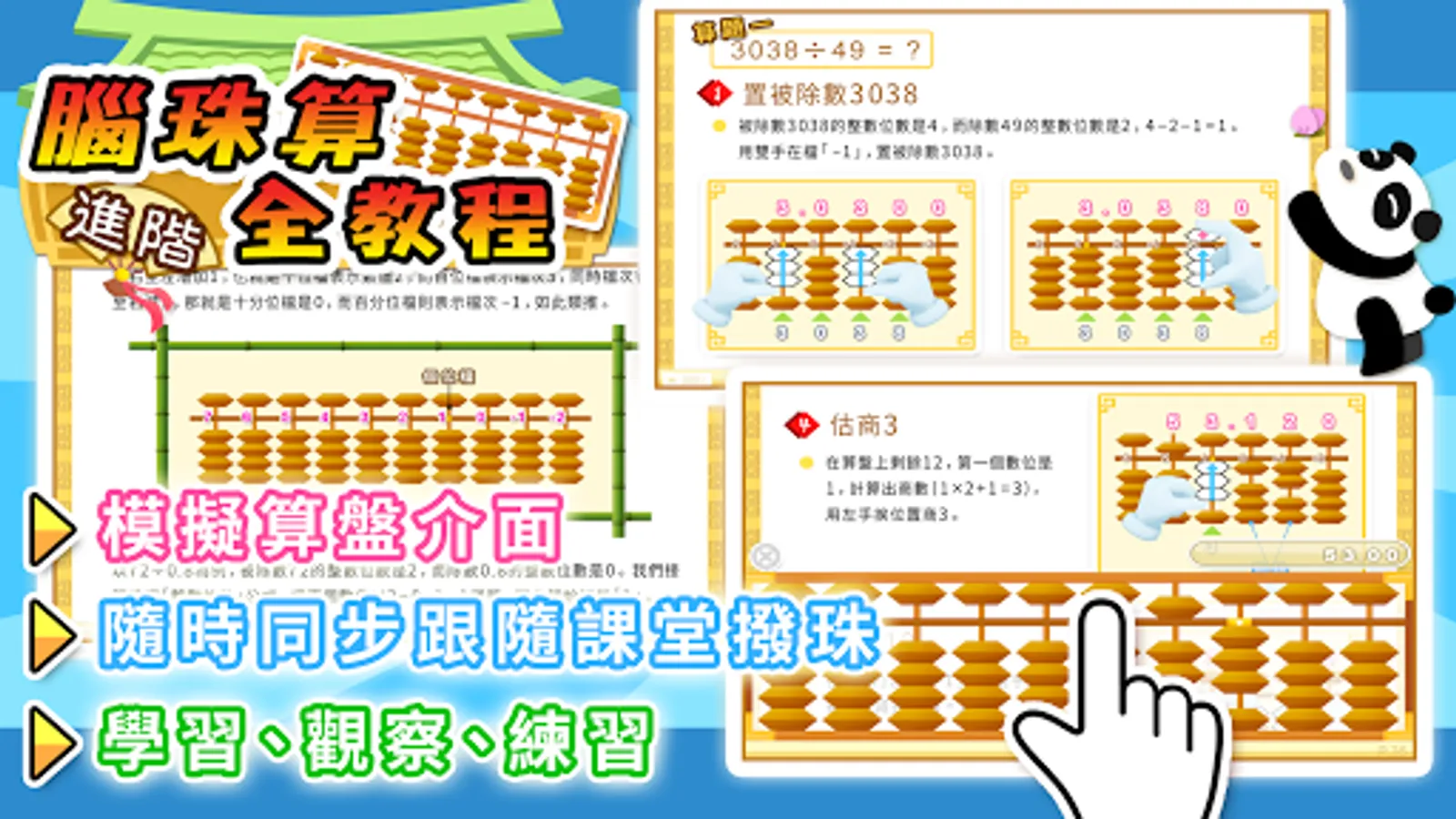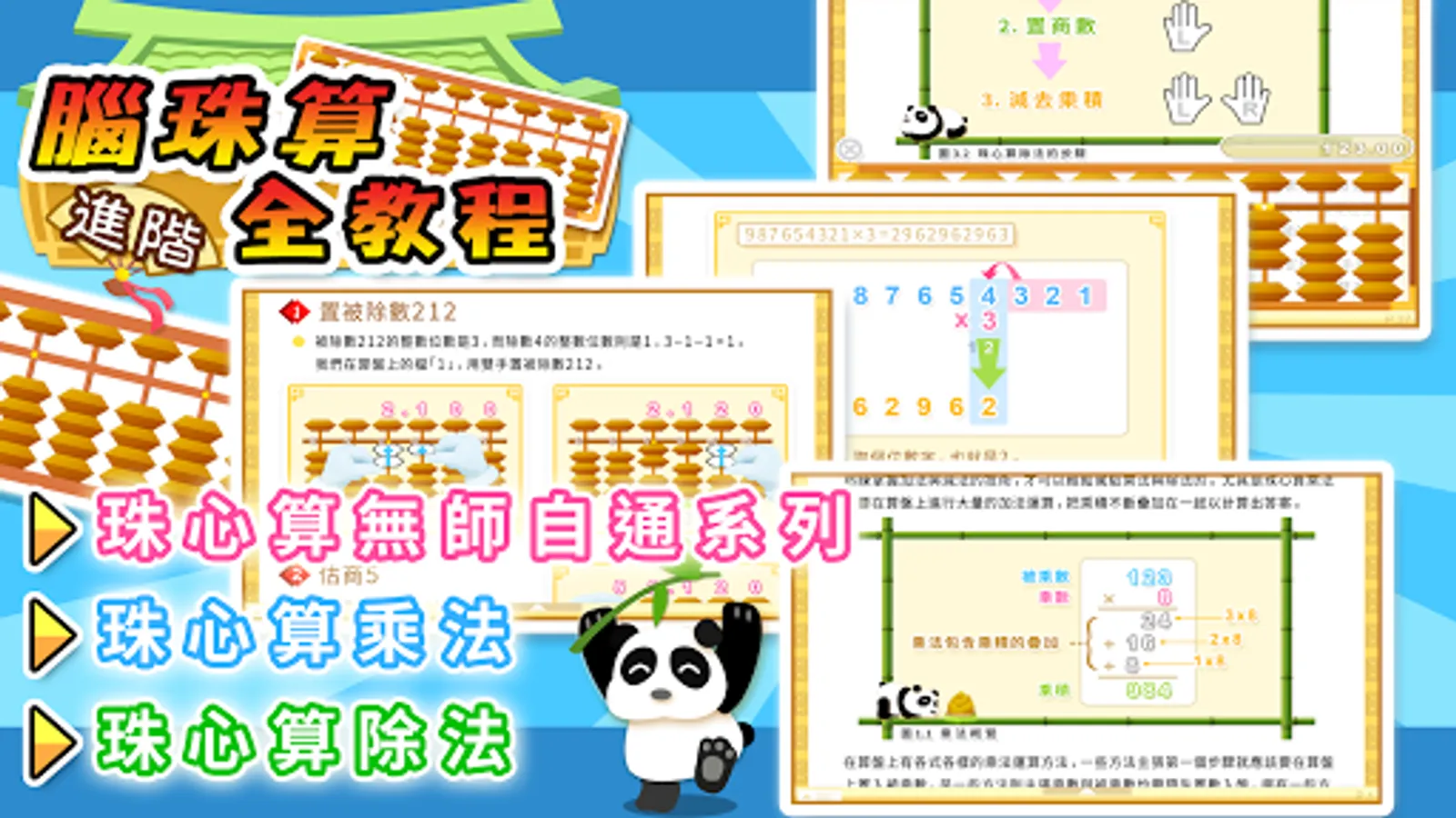 「腦珠算全教程(進階)」集中講解珠心算的乘法與除法, 內容劃分為兩個部分, 分別是互動教程與雙手運珠解題示範器, 配合乘除法專門的選項讓學習更得心應手。