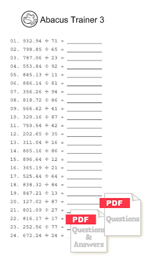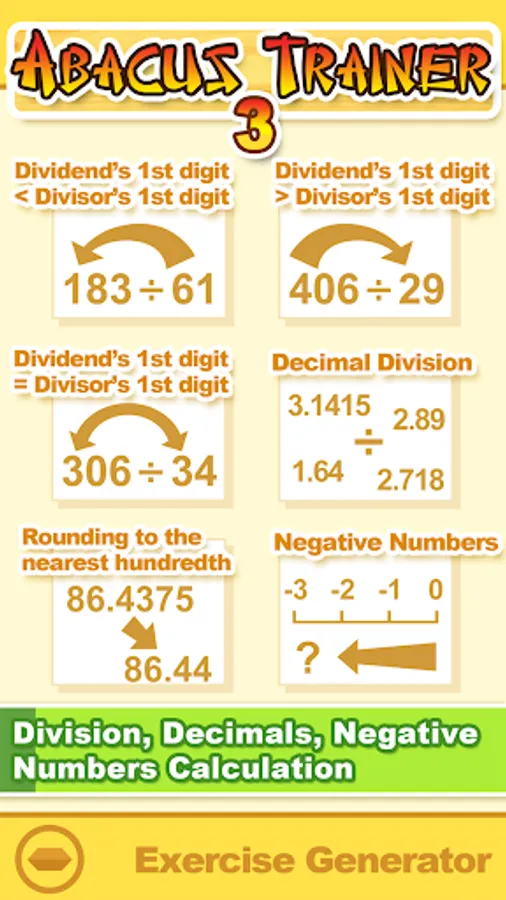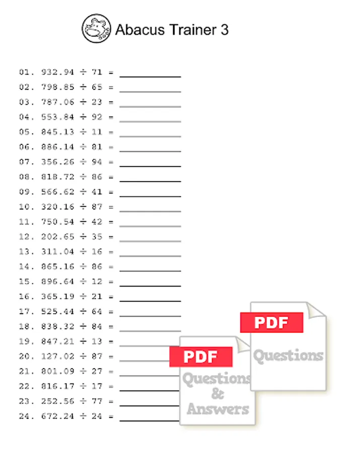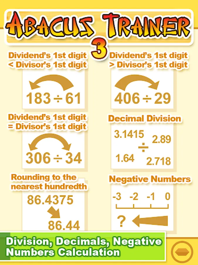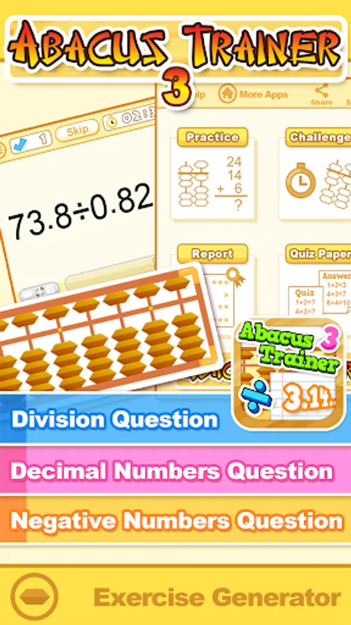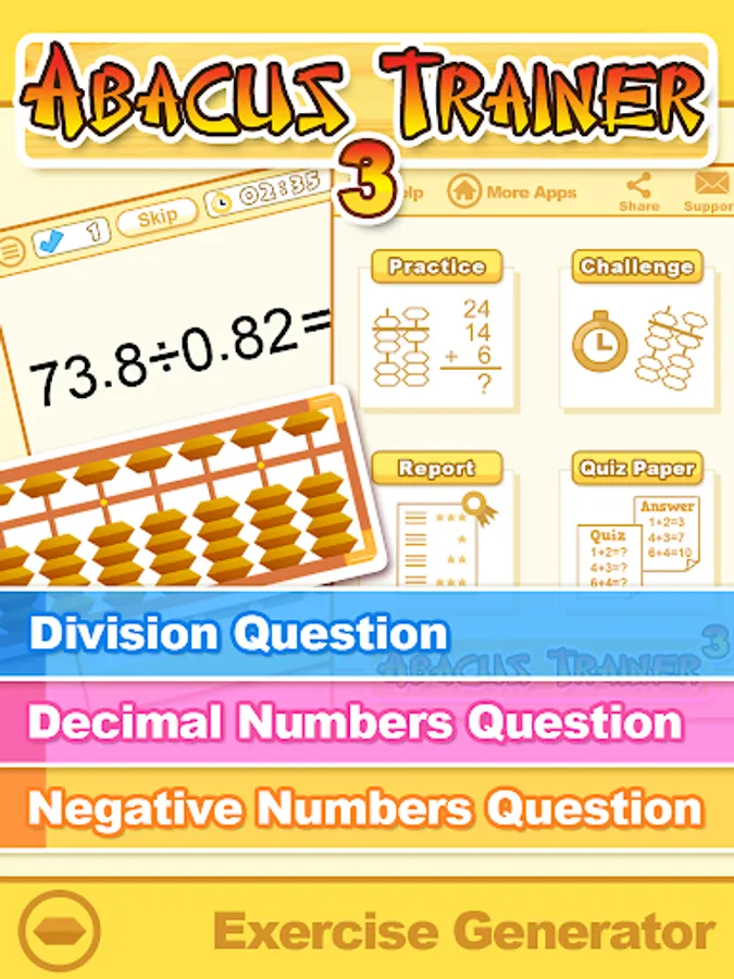 Abacus Trainer 3 is a question generator focusing on the skills acquired in division and negative numbers. It provides a whole range of options that can be flexibly selected to fit the drilling needs. Users are able to practise on every aspect of abacus division, decimals and rounding techniques learnt in Book 2, as well as negative numbers learnt in Book 3. Flexible answer input can be entered either by using abacus or numeric keys.
