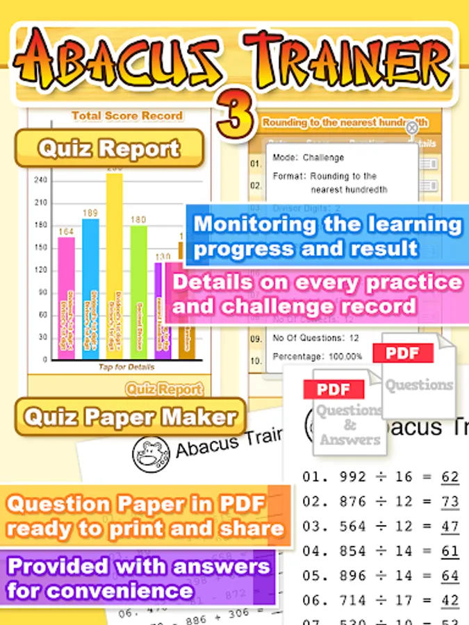 No matter practice or challenge modes, the performance, score and every detail will be recorded in report, which is useful for learning progress monitoring. The report records assist you to find out the strength and weakness, a customized approach in abacus training can be derived as a result.