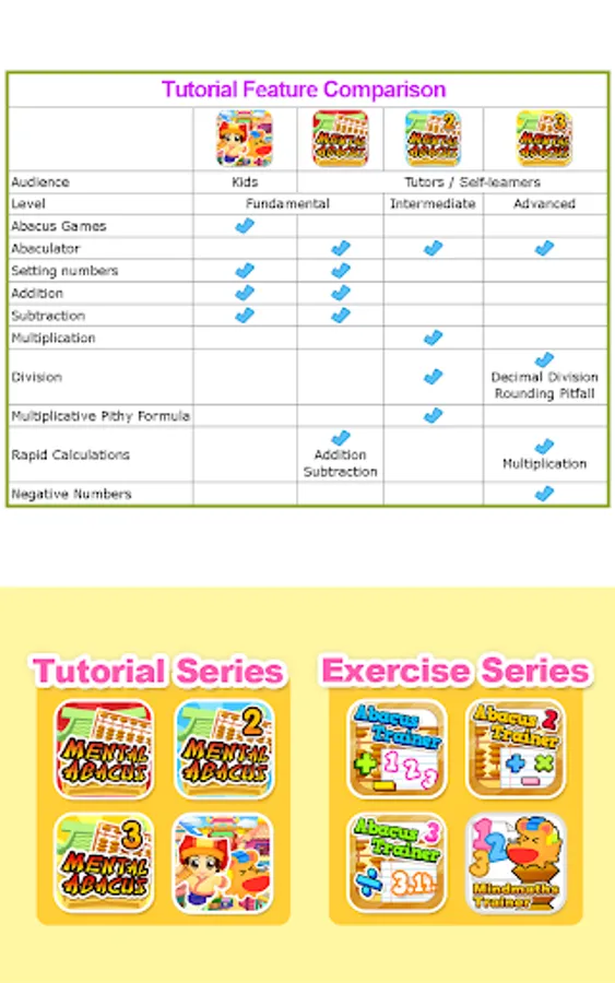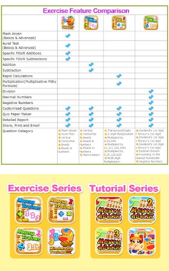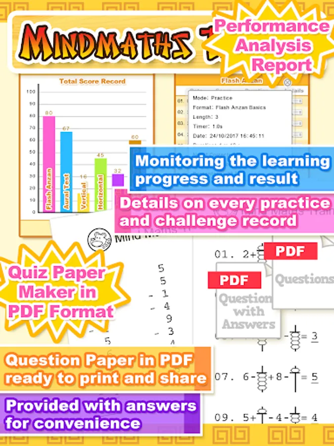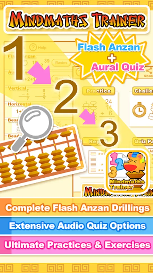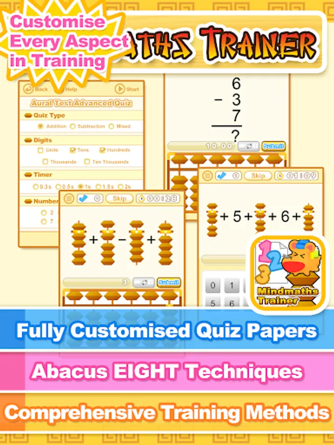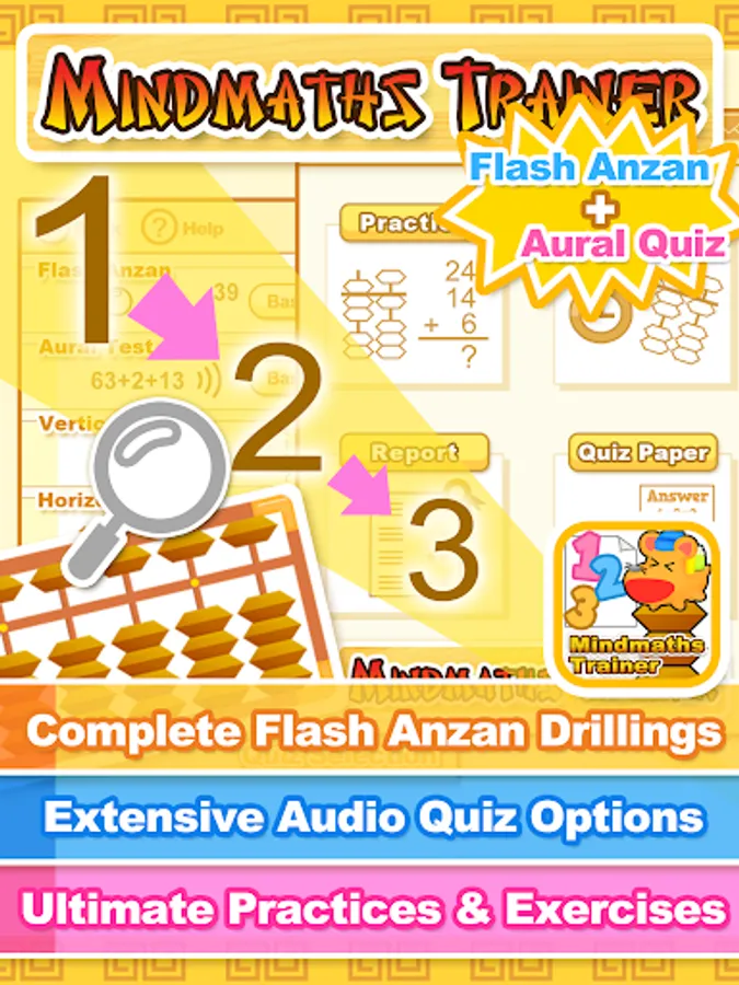 Mind Maths Trainer provides popping up questions (Flash Anzan) and audio listening calculation (Aural Test). It focuses on specific FOUR abacus addition and FOUR abacus subtraction techniques too.