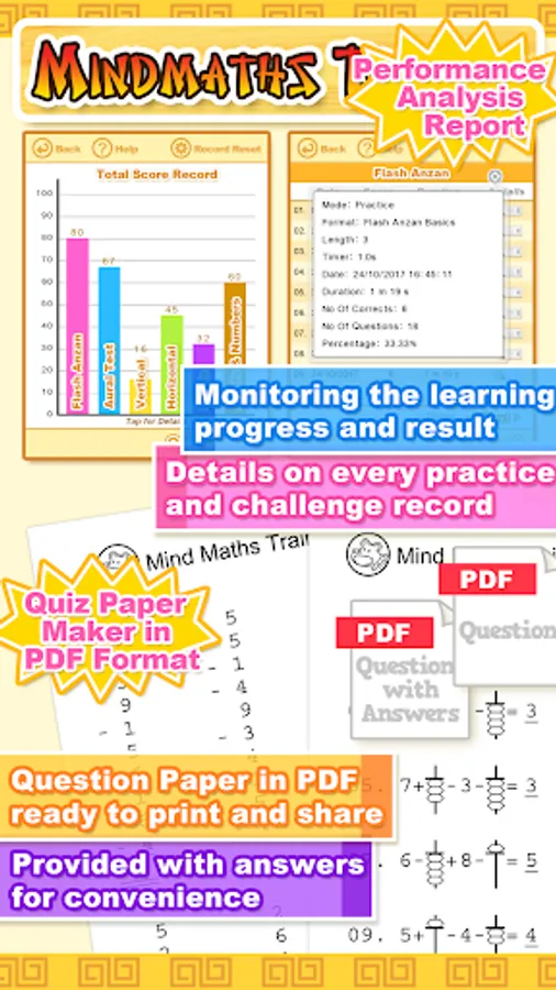 Apart from doing the exercises directly on mobile and tablet in a timed way, export both the quiz paper and the answer paper in PDF format to aid offline exercises. All questions are generated randomly to ensure no quiz paper will be identical. Print and email functions are also provided for your convenience.