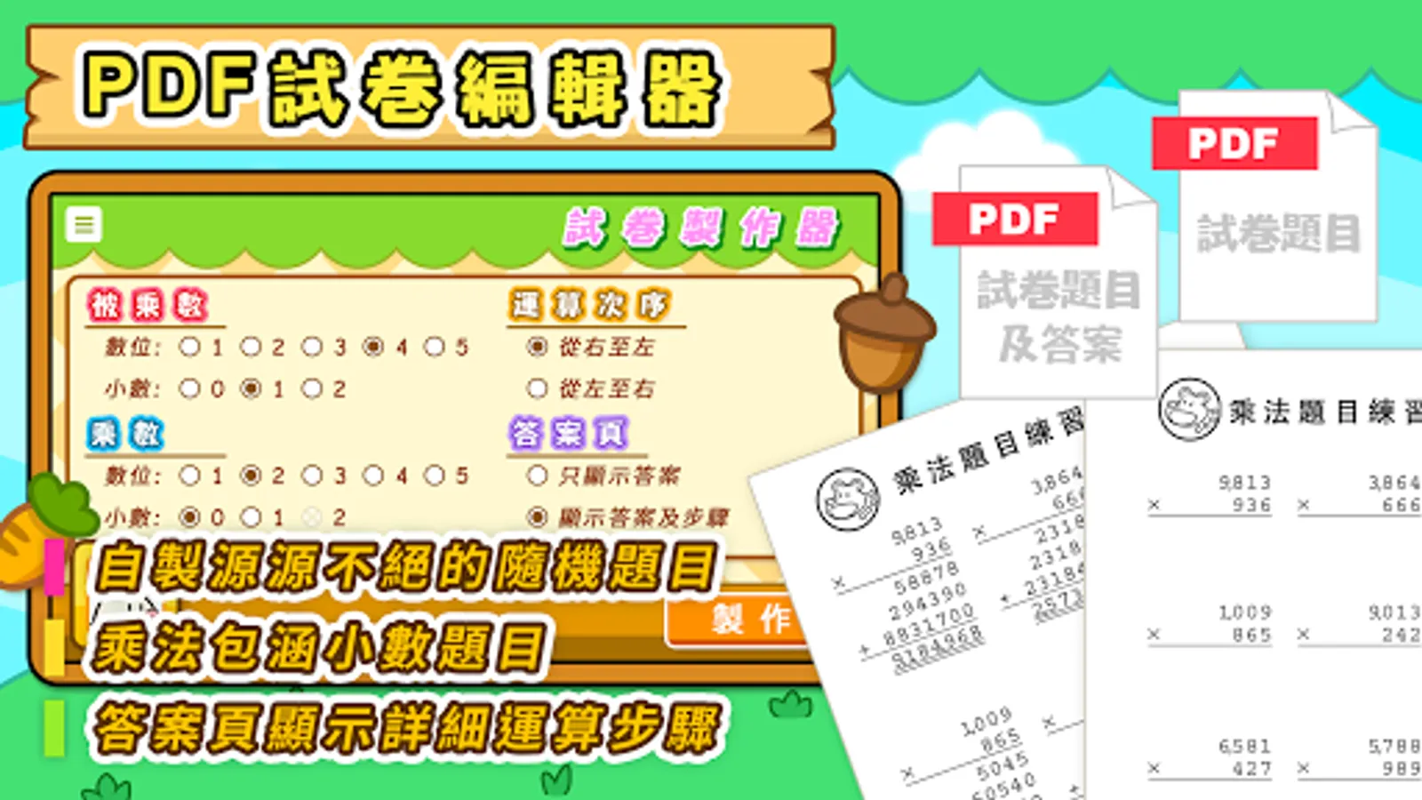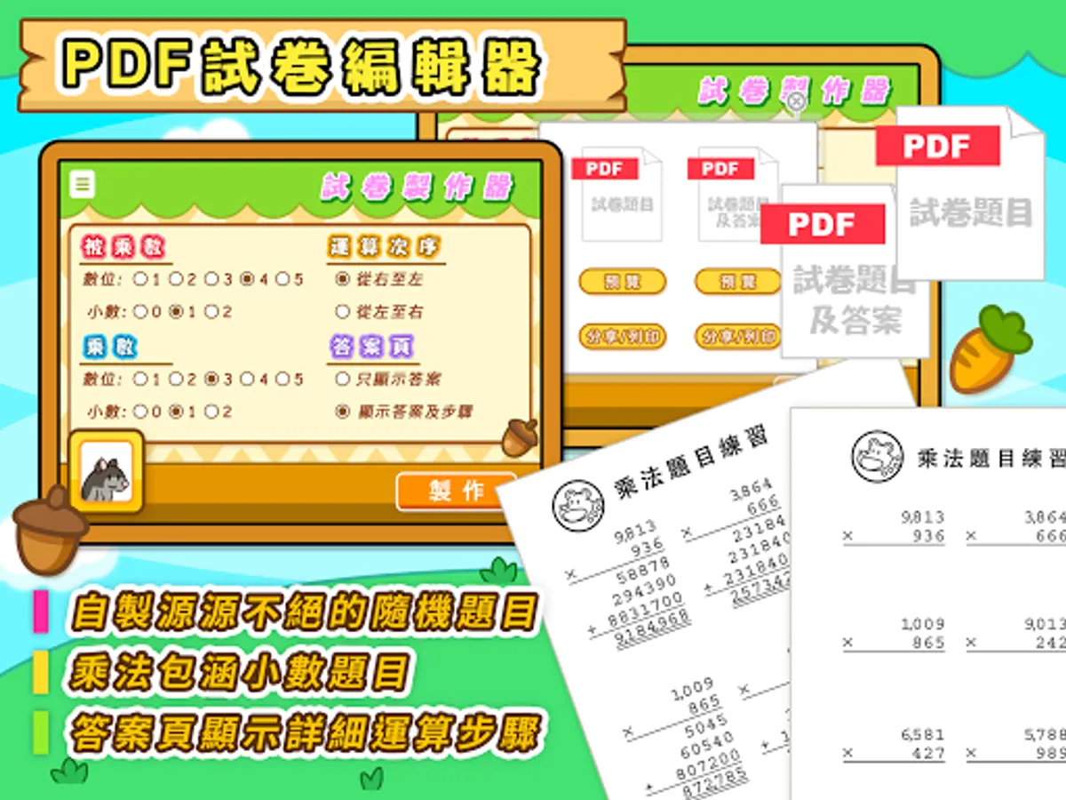 只要輸入題目選項,就能得出相應的源源不絕隨機題目,同時也能得到題目的答案頁,答案頁更可設定是否顯示詳細的運算步驟與方向。