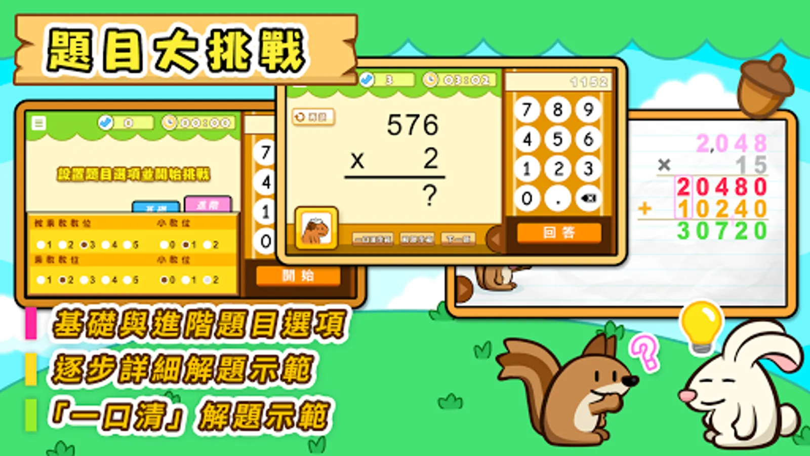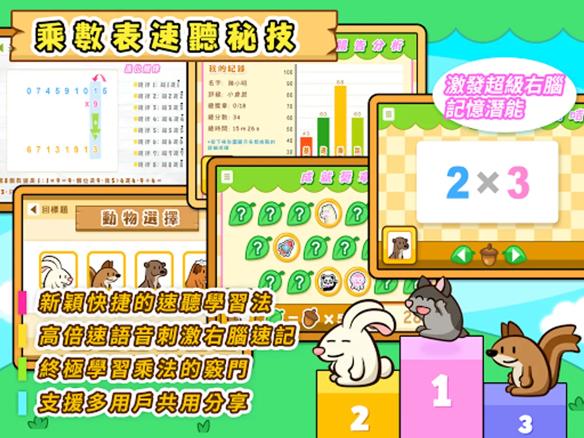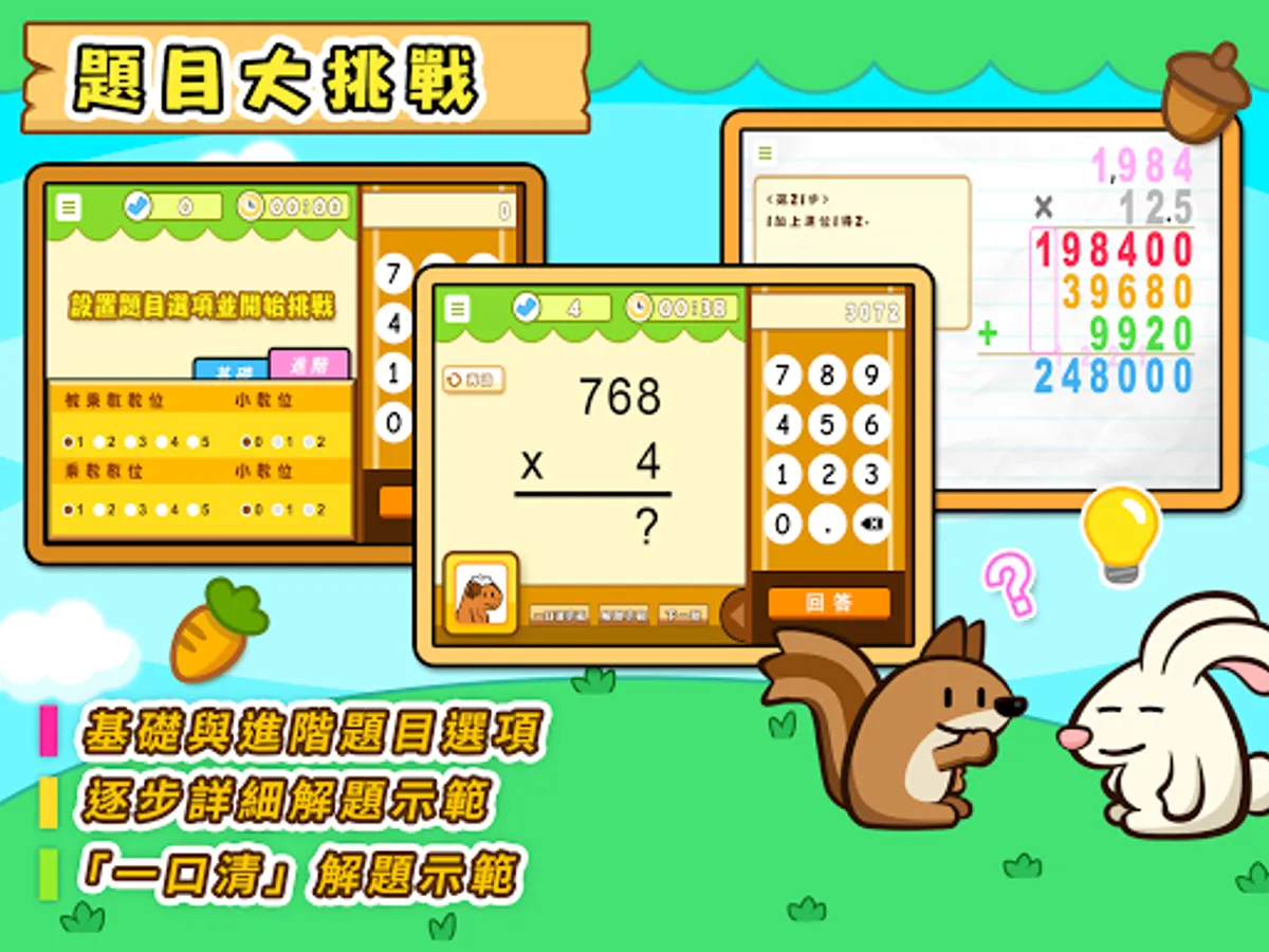 針對個人的強弱項自訂題目,全面的選項覆蓋各類型的乘法,不重覆及源源不絕的隨機題目有助提升學習的興趣,同時支援國語,粵語語音的聽算挑戰選項。
