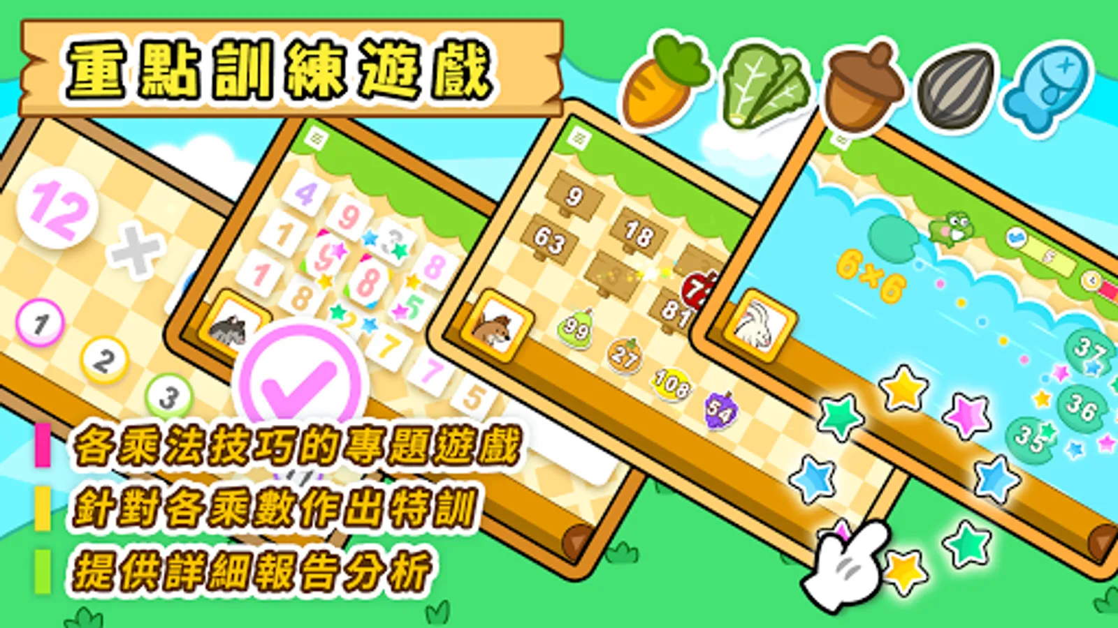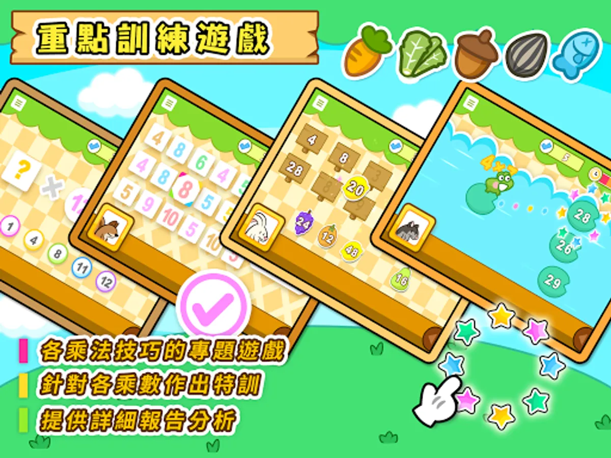 針對不同的乘法技巧,特設多款生動有趣的互動專題遊戲,各遊戲除了吸引兒童的注意力,亦鼓勵他們領會學習數學的箇中樂趣,從而幫助深化他們對乘法的各類知識。
