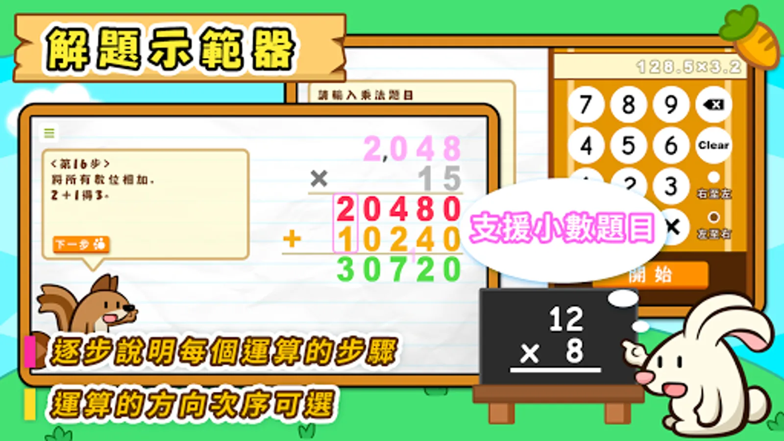 輸入乘法題目後,系統會逐步詳細顯示並說明每個運算的步驟,運算的方向次序可以選擇為「左至右」或「右至左」。