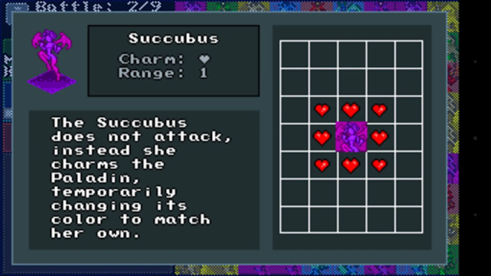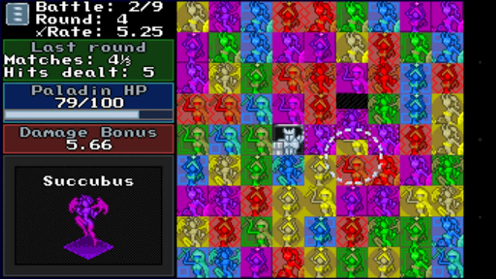 Match 3 or more demons of the same color in a row to make matches, and if they are correctly positioned to attack, they will strike the Paladin.