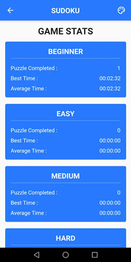 🔢 Track your progress for each difficulty level: analyze your best time, average time and other achievements.
