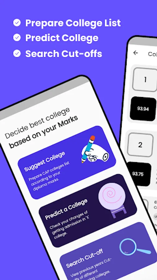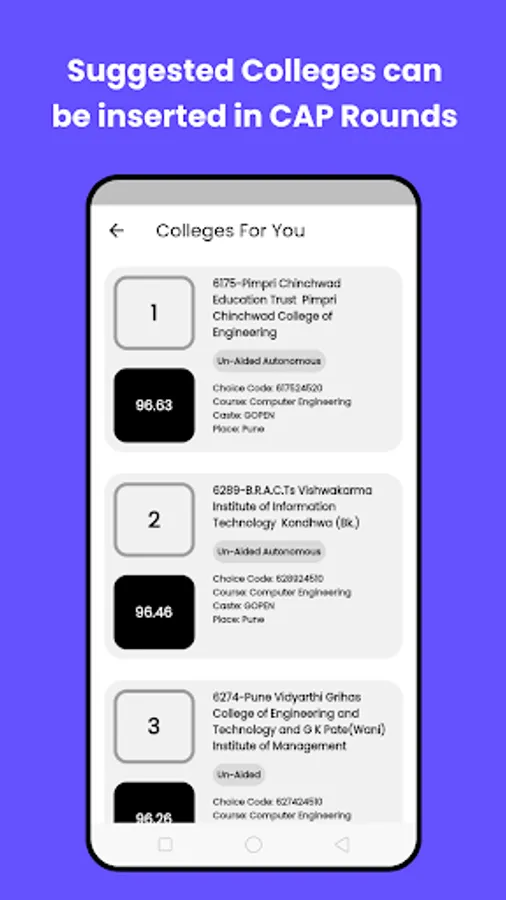 In this feature, the app automatically prepares the Colleges List according to the student’s Percentage obtained in Diploma Course. Student just have to insert his/her obtained Percentage, preferred Course Name, preferred Place, Category and preferred College Status.