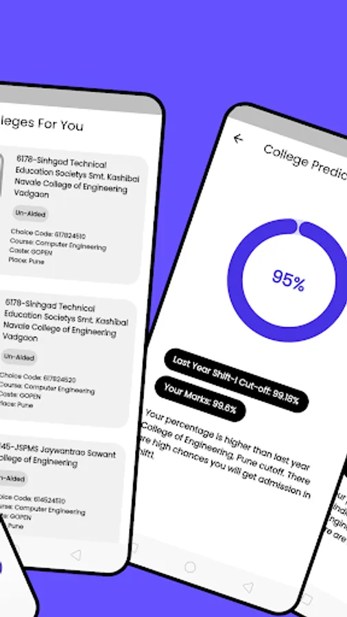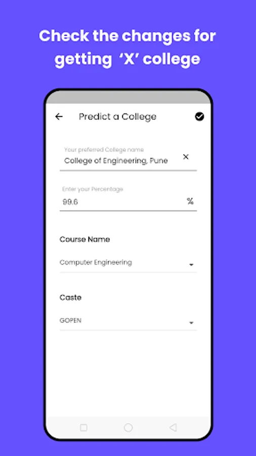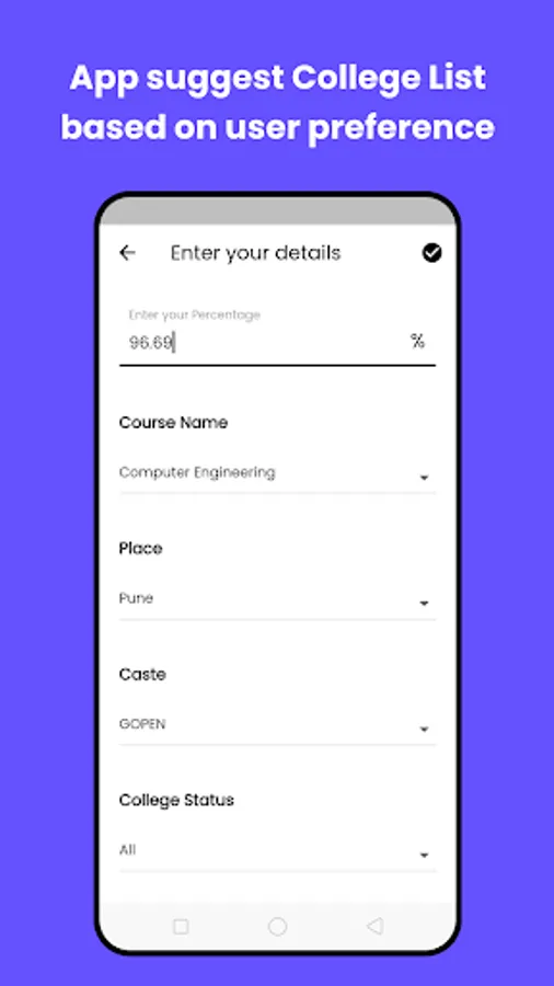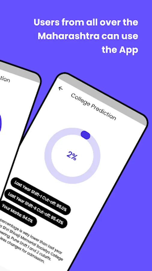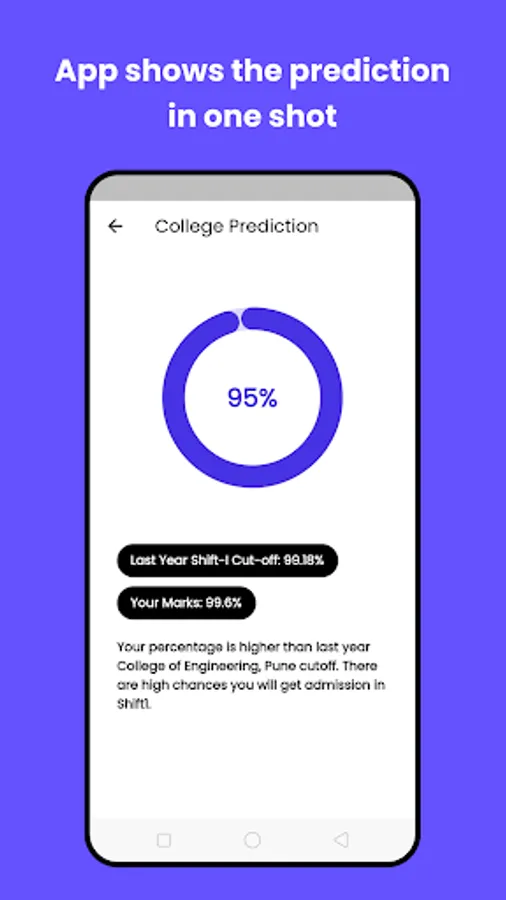 The app shows the prediction between the scale 0-100%. Thus, using this feature, student can check the chances of getting admission in any College in Maharashtra in one shot.