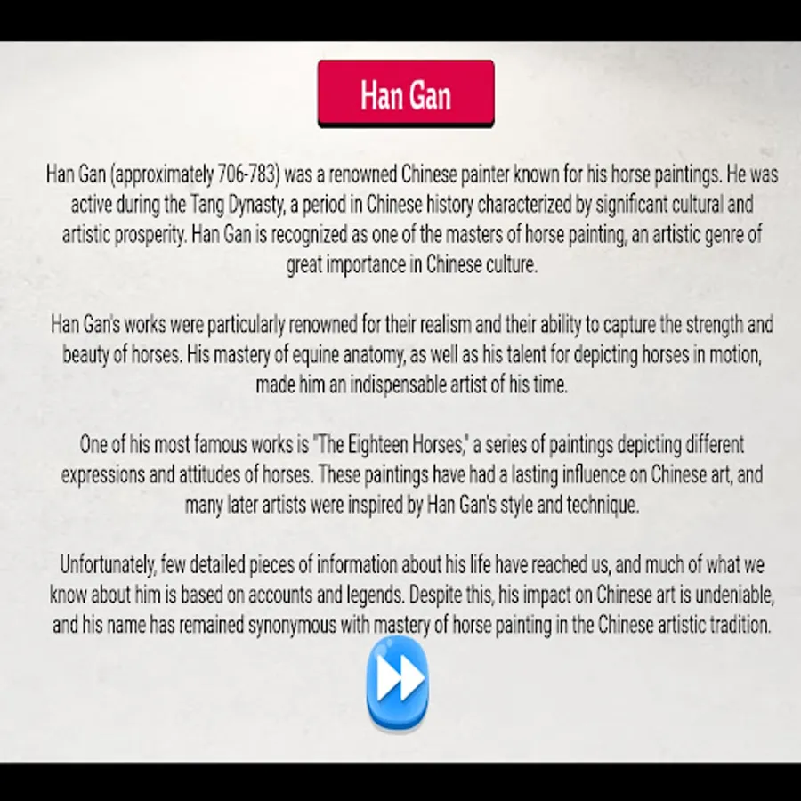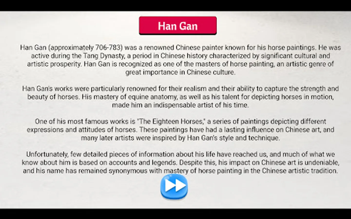 Han Gan (around 706-783) was a Chinese painter, primarily recognized for his magnificent depictions of horses. Active during the Tang Dynasty, a period of cultural prosperity in China, Han Gan is considered one of the masters of equine painting, an essential artistic genre in Chinese culture. His works were renowned for their captivating realism, highlighting the power and beauty of horses. His mastery of equine anatomy and his ability to capture motion made him an indispensable artist of his time.