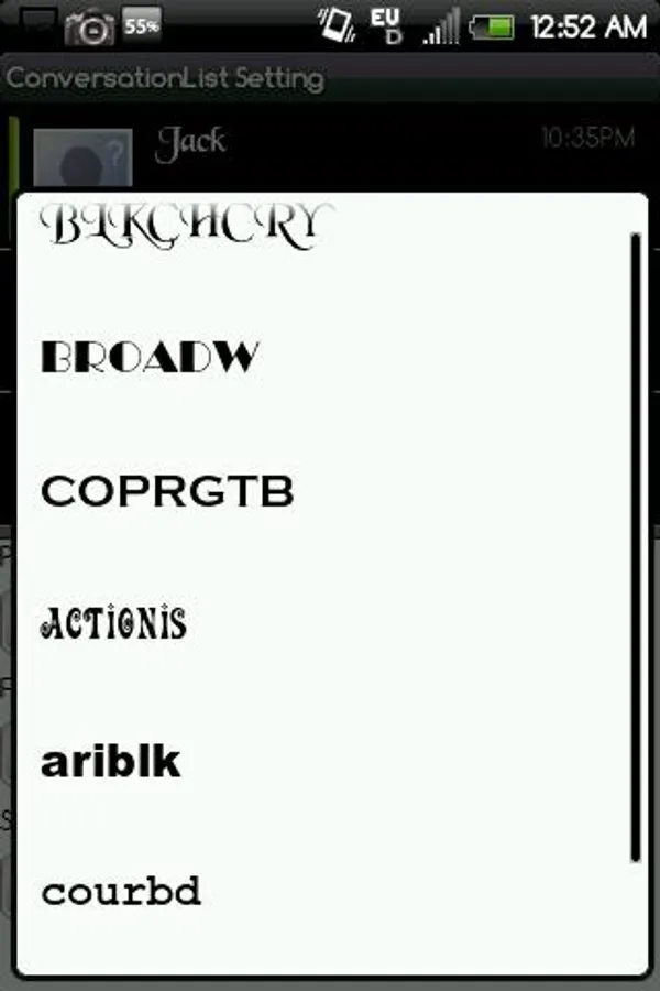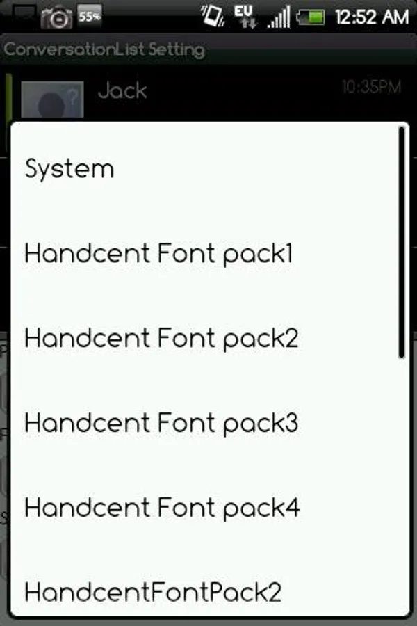 Click "ConversationList Settings" Then Choose "Contact Font",Click "Font Pack" drop down list, And you will see a list,for example: Handcent SMS font pack1,Handcent SMS font pack2,Handcent SMS font pack3,Handcent SMS font pack4,Handcent font pack5...choose one of these packs,if you haven't installed it ,handcent will navigate you to the market and you can install it directly. after you have choosen font pack ,you can choose font at the packs and define the style ,size and so on