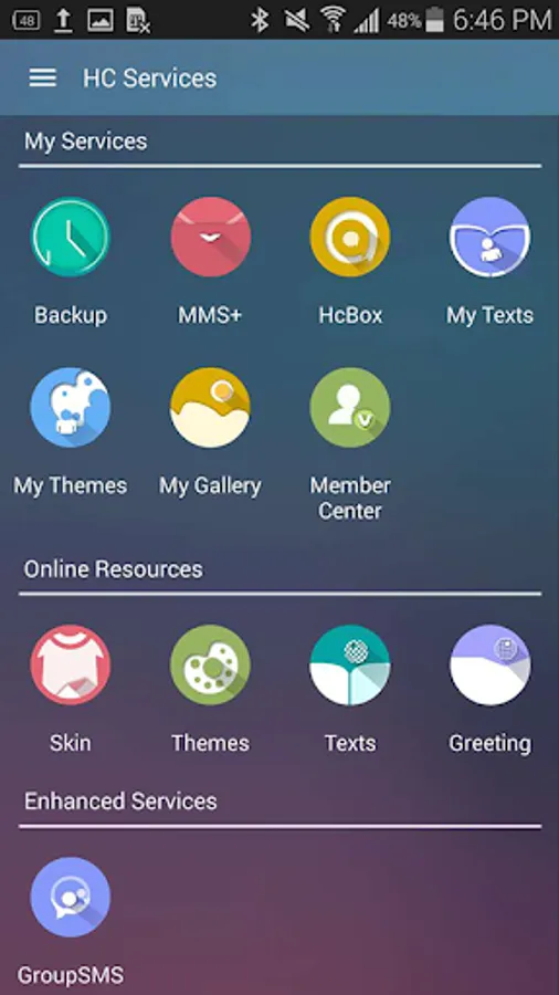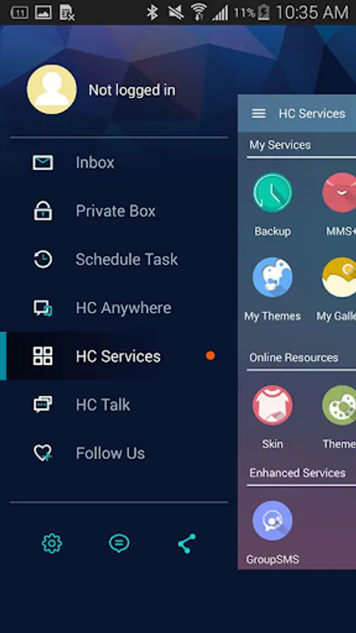 Open navigation drawer->Handcent Services->Skin
