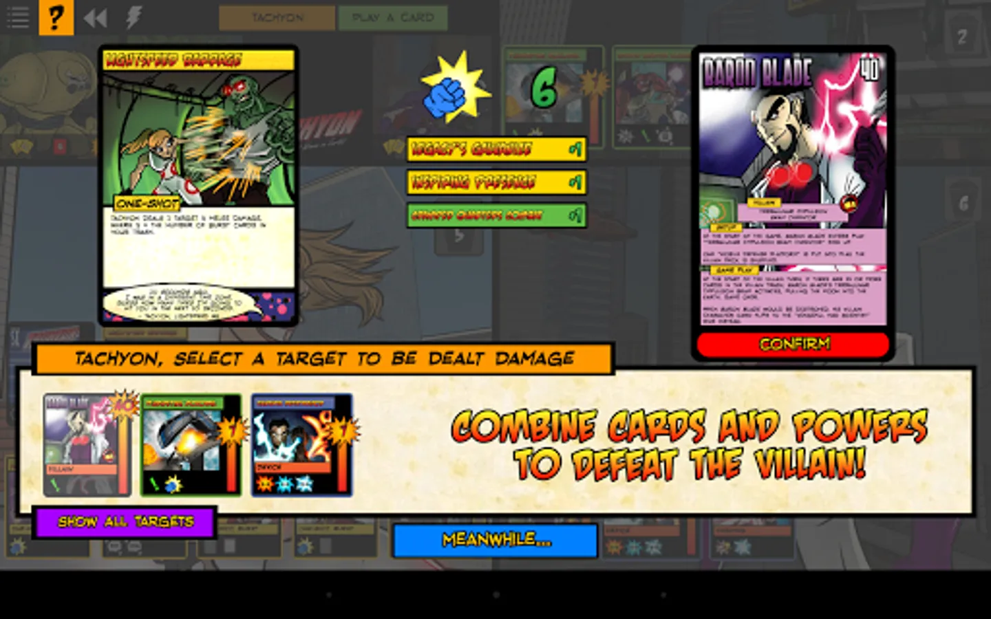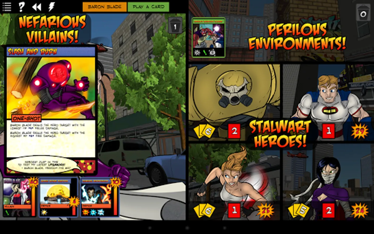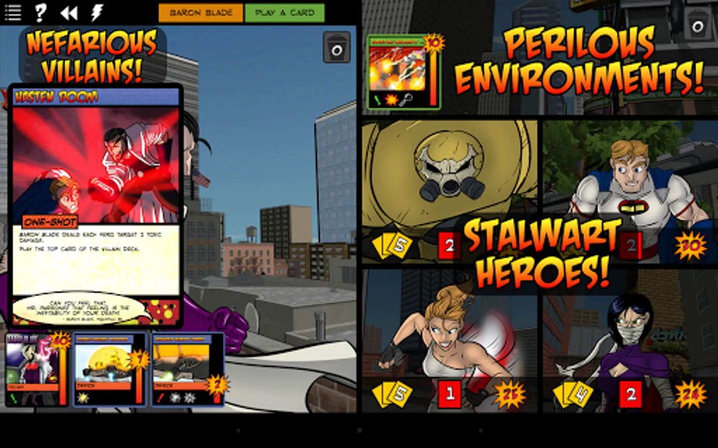 The digital version of SotM plays like a comic book come to life! Control an entire team of heroes in single player, or head online and join heroes from around the globe in multiplayer. This is cooperative card-battle like you’ve never played before!