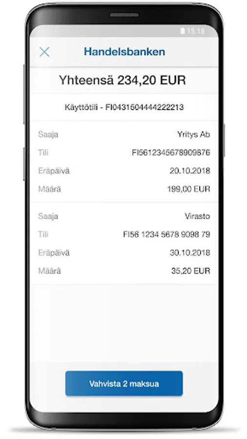 With Verify, you can sign up with Handelsbanken's Mobile Bank, Netbank and Corporate Web Bank and validate payments and transactions. You can safely identify third-party services such as tax.fi or kela.fi. Your online auction will also be successful with the Confirmation app.