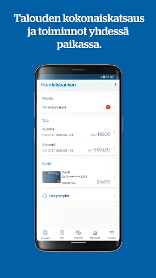 At Handelsbanken's mobile bank, you take care of your daily money matters. To use mobile banking, you need an online banking agreement, which you sign at your own branch.