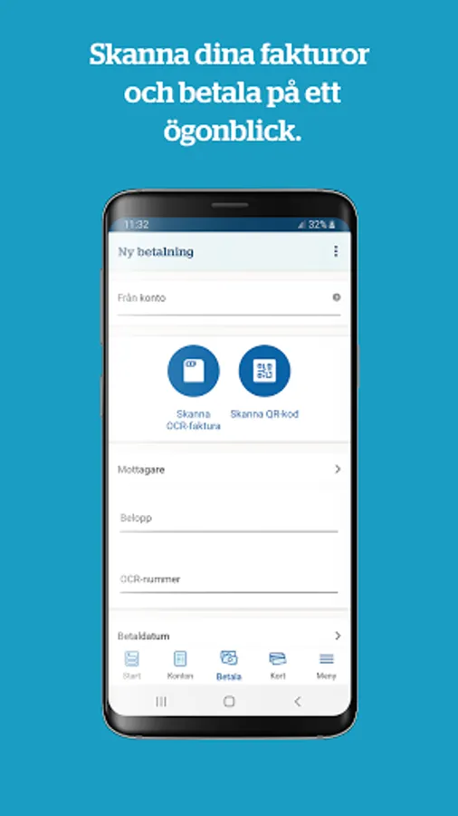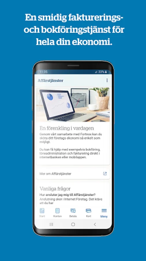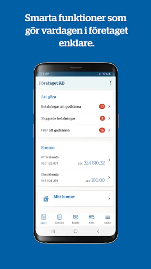 You log in to the app with a personal code, or with Mobile BankID. You also need to have the authorization Mobile Service Company in your power of attorney. The app can request access to the camera to scan invoices and to the phone's location services to locate the nearest offices and ATMs. If access is denied, these services cannot be used.