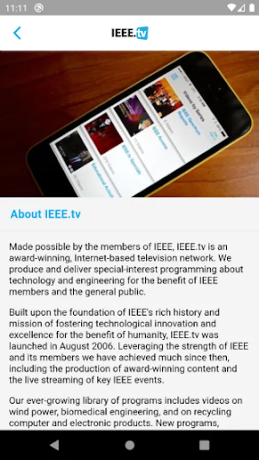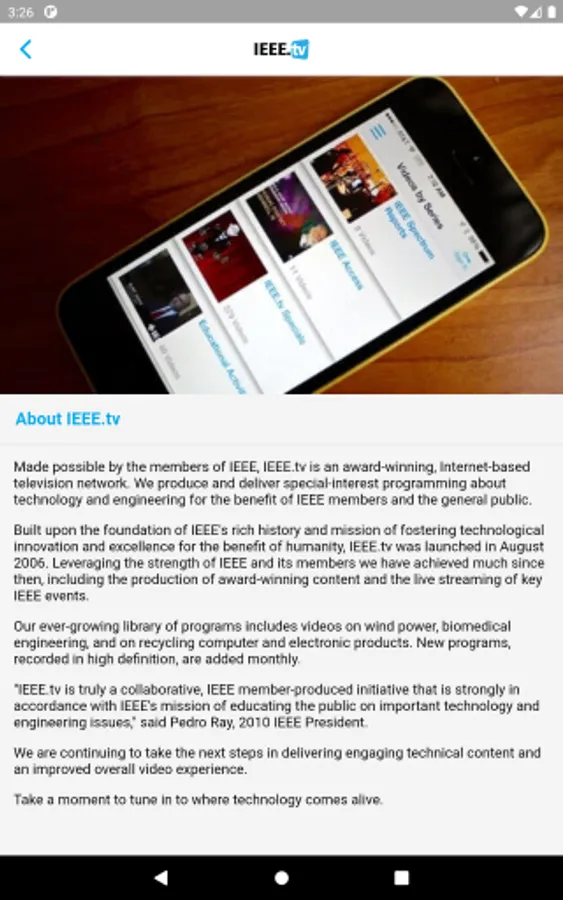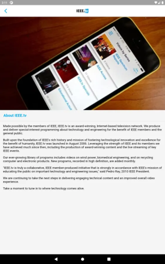 Tune in to where technology comes alive. IEEE.tv is an award-winning, online video network made possible by the members of IEEE. We produce and deliver special-interest programming about technology and engineering for the benefit of members and the general public.