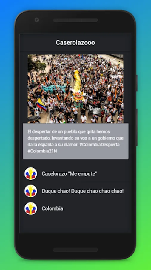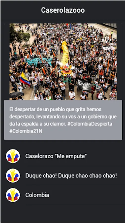 A simple application that simulates the sound of the cacerolazo made in Colombia on November 21, 2019, where a town was manifested in the capital of Colombia.