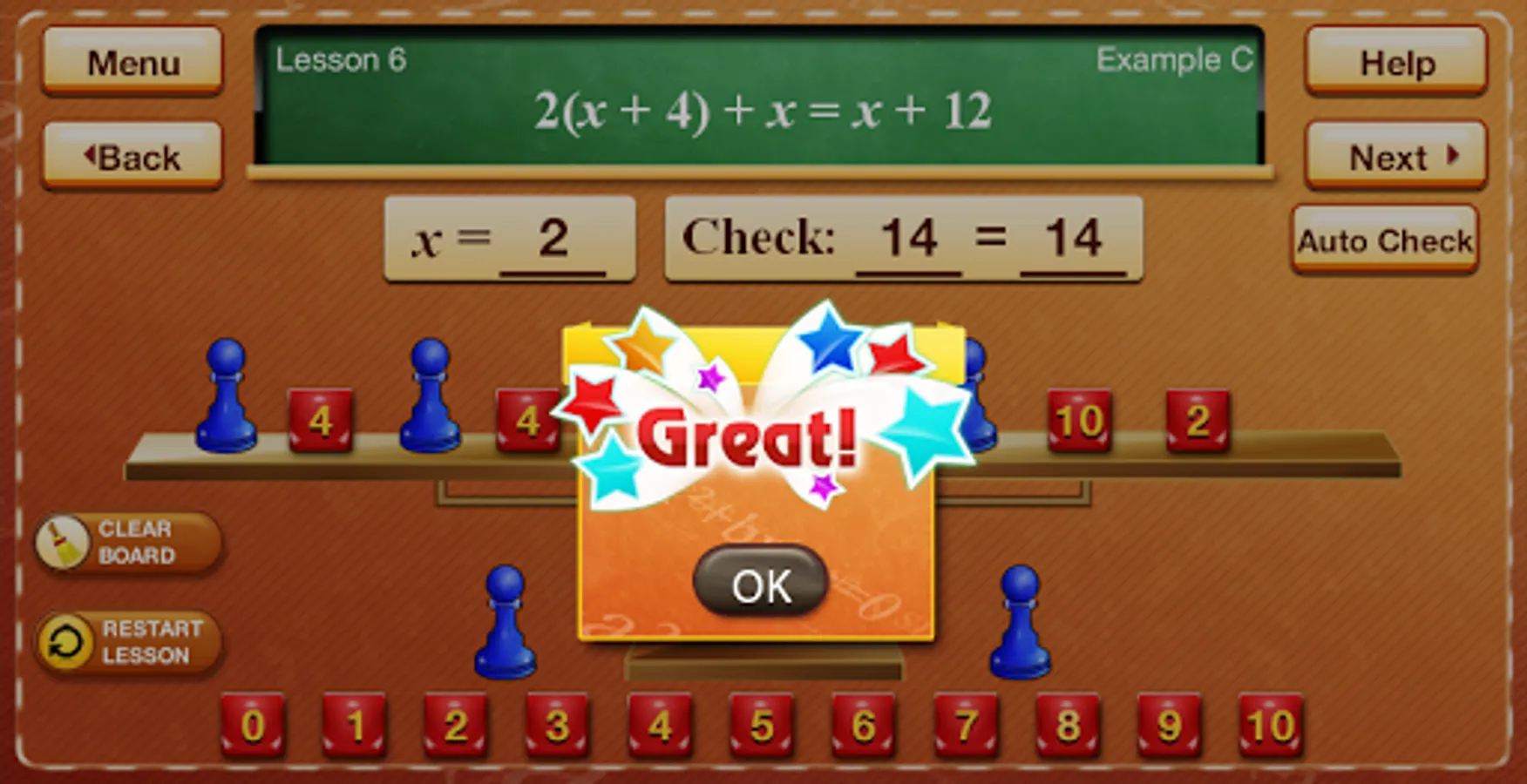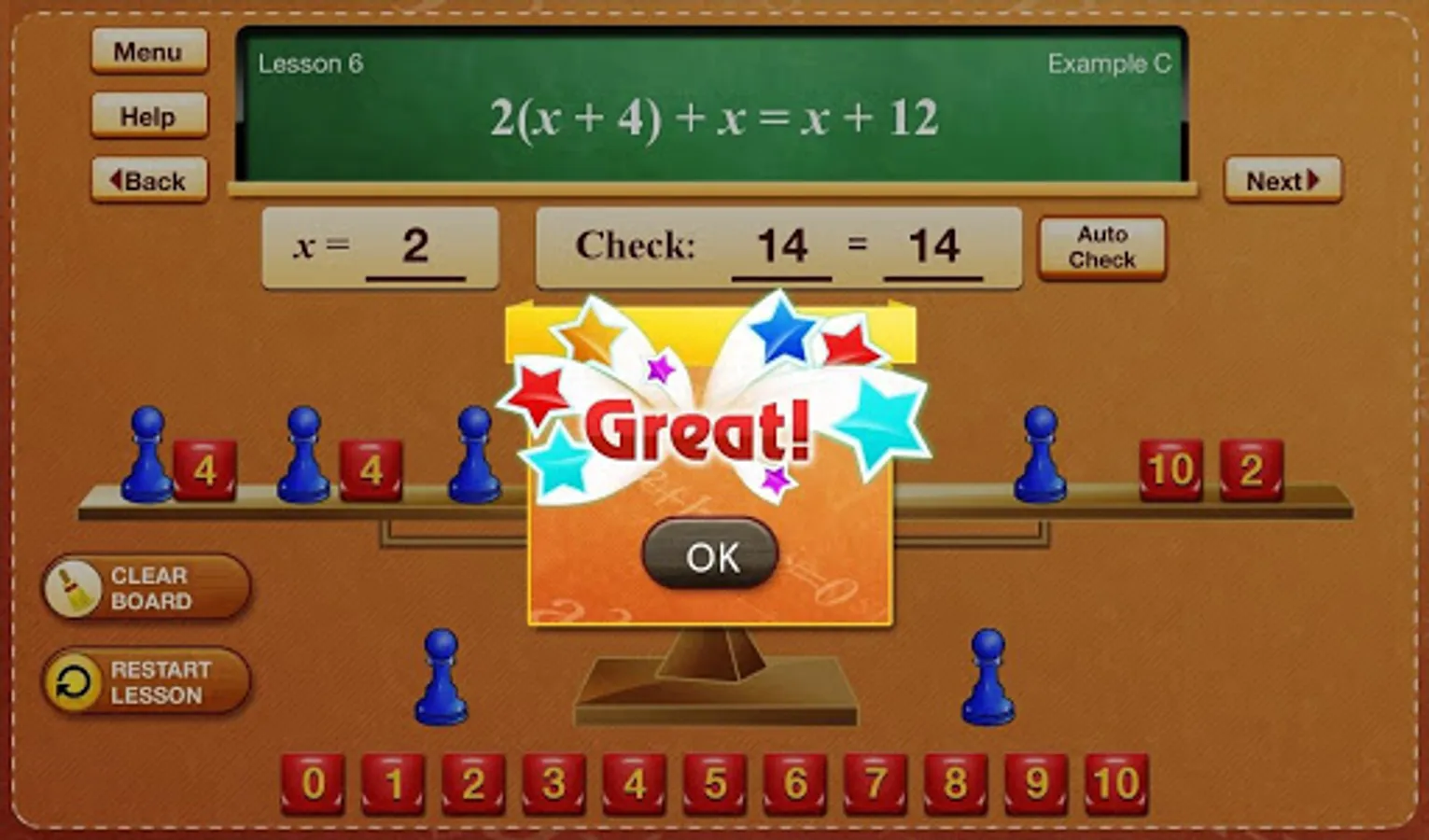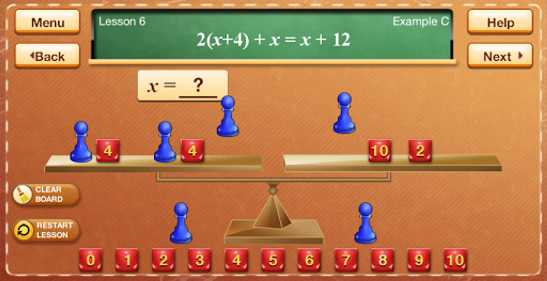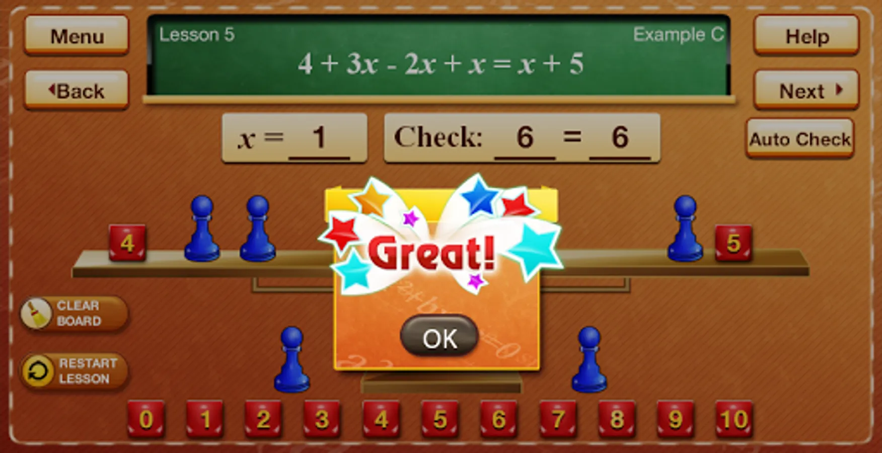Algebra can be a tricky subject to master, but with the help of the Hands-On Equations 1 app, equations such as 4x+2=3x+9 and 2(3x+1) = 2x + 14 become child’s play! The original Hands-On Equations program, using physical game pieces, has already helped more than a million young students in the United States gain confidence with algebra. Now that same, proven method is available virtually in the palm of your hand.