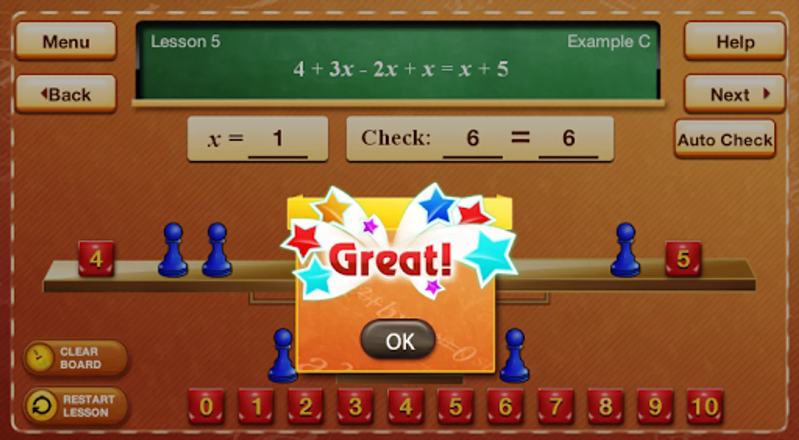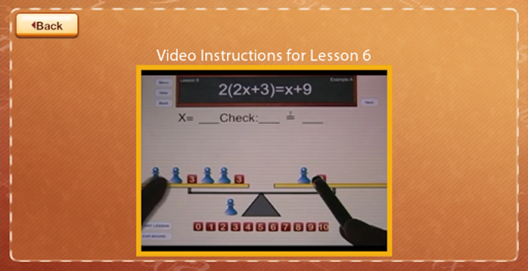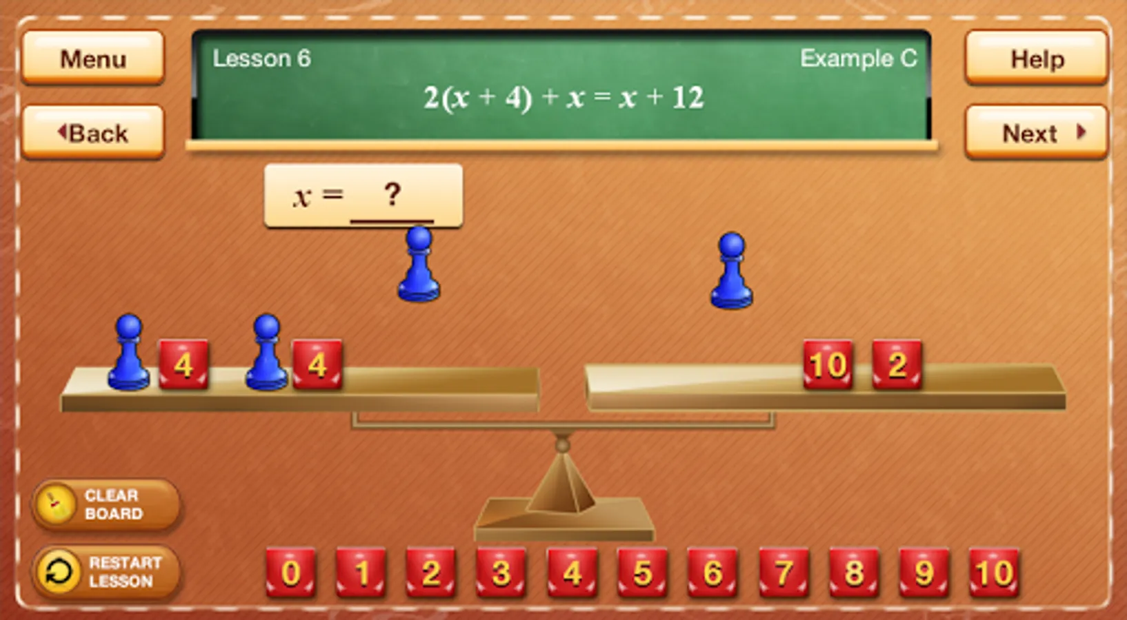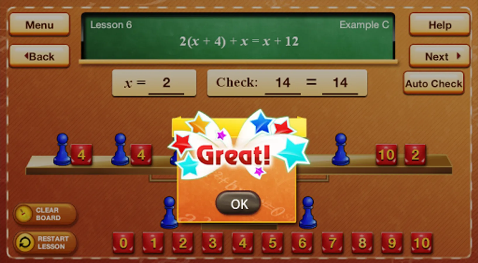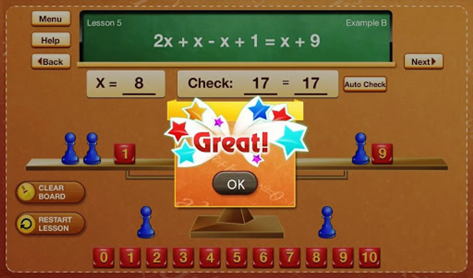 Algebra can be a tricky subject to master, but with the help of the Hands-On Equations 1 app, equations such as 4x+2=3x+9 and 2(3x+1) = 2x + 14 become child’s play! The original Hands-On Equations program, using physical game pieces, has already helped more than a million young students in the United States gain confidence with algebra. Now that same, proven method is available virtually in the palm of your hand.