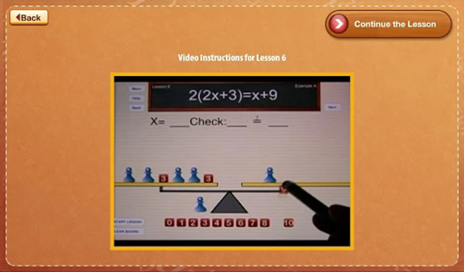 •Beginning with Lesson 2, the student places the game pieces on the balance scale to represent the two sides of the equation.