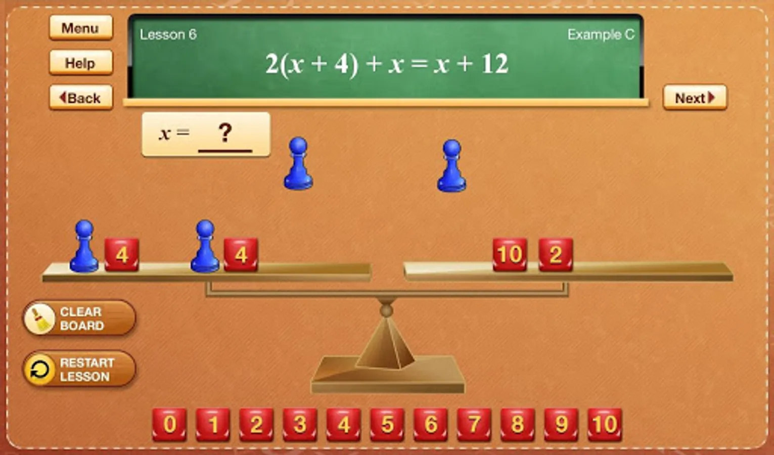 •The unknown x variable is represented by a blue pawn on the digital screen while the constants by number cubes.