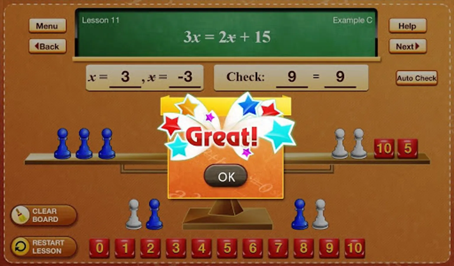 High school students struggling with algebra will likely experience success and understanding for the first time as they work with this app.