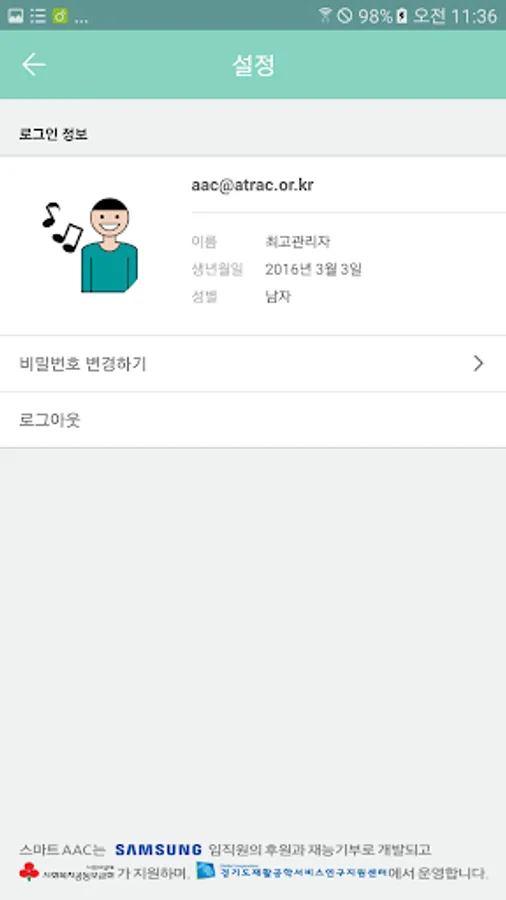 AAC is sponsored by Smart and talented base of employees, Samsung Electronics, Gyeonggi Rehabilitation Engineering Research Center jointly developed the service and the Complementary and Alternative Support Community Chest communication (AAC) applications.