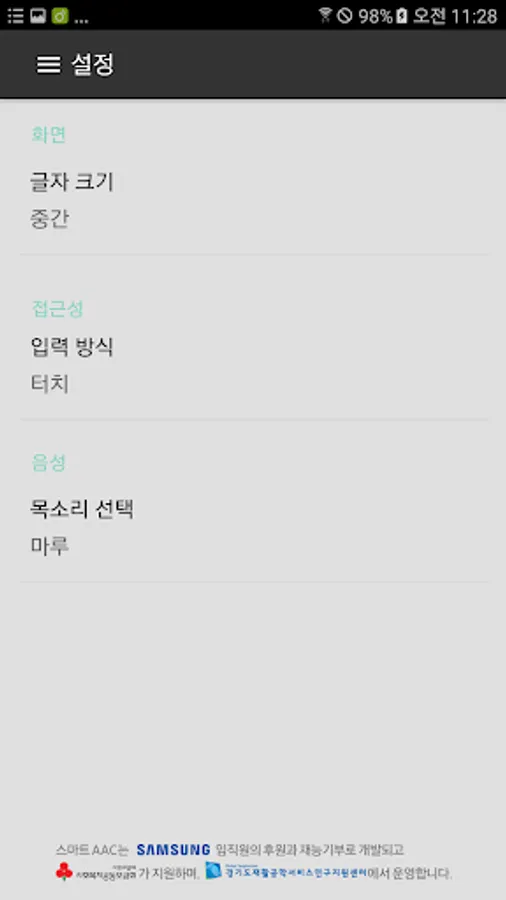 Smart AAC is a complementary alternative communication (AAC) application jointly developed with Gyeonggi-do rehabilitation engineering service research support center and supported by the Social Welfare Community Fund with the support and talent donation of Samsung Electronics employees.
