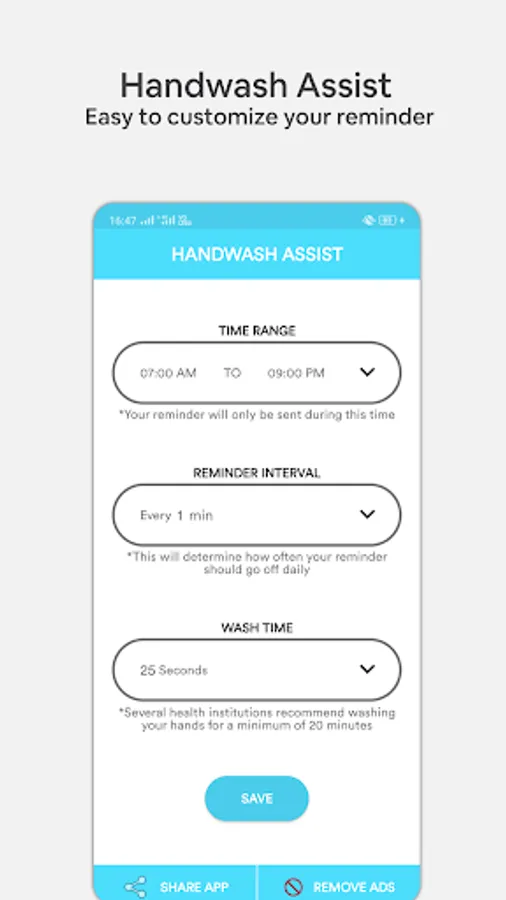 You save your settings and that's it, the app will reminder you based on your saved settings to wash your hands.