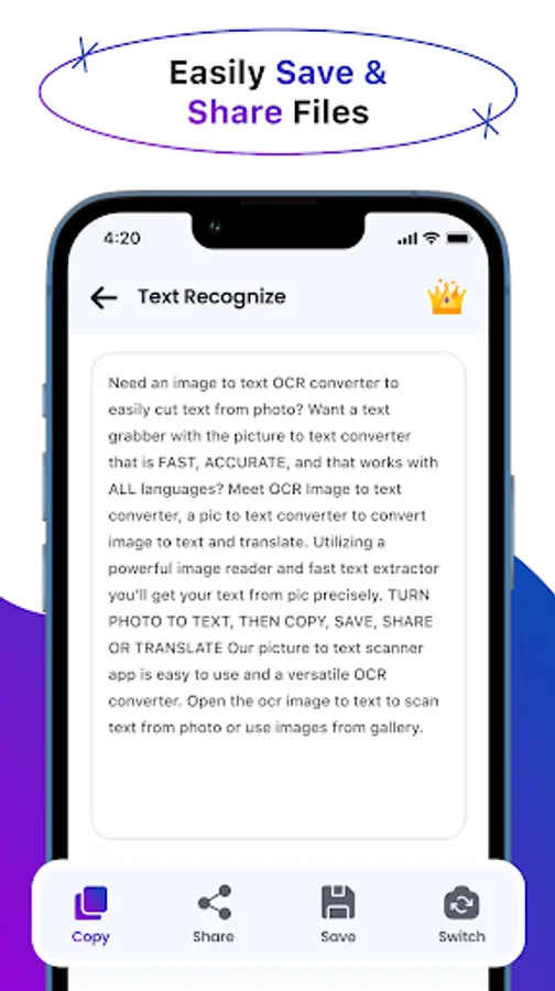 Editing Tools: The app may offer basic editing tools such as cut, copy, and paste, allowing users to edit the converted text easily.