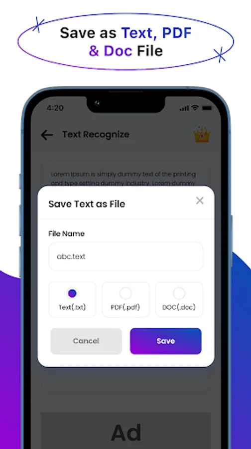 Exporting Options: Users can export the converted text as a plain text file or save it as a document in popular formats like PDF & Text.