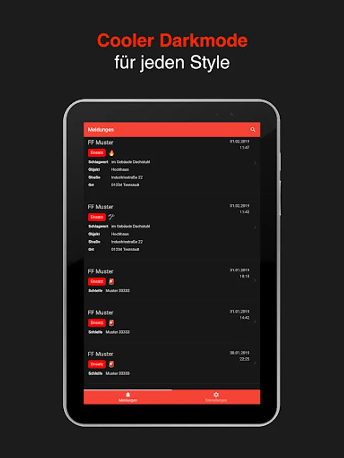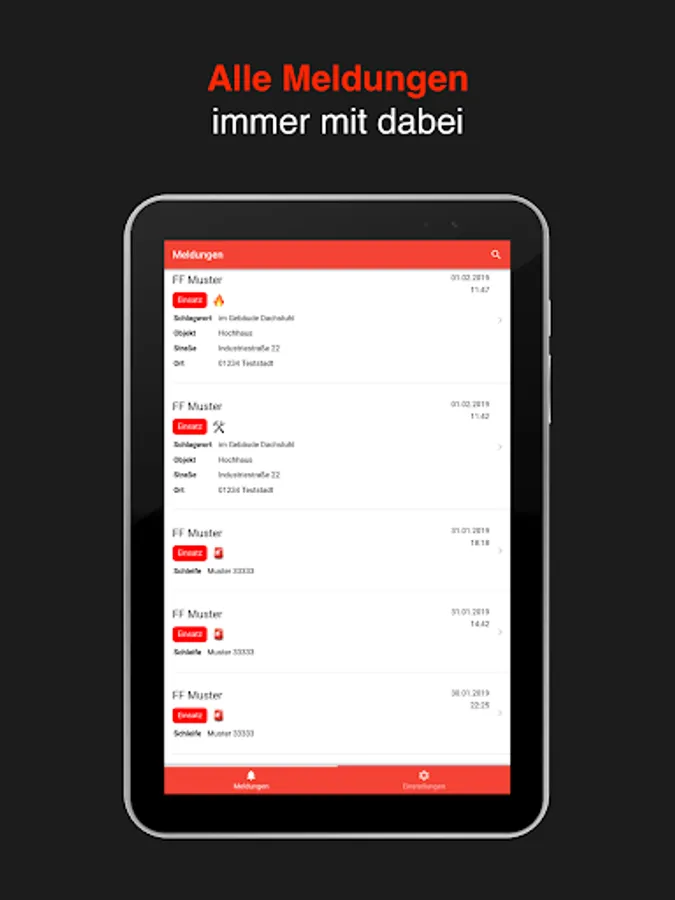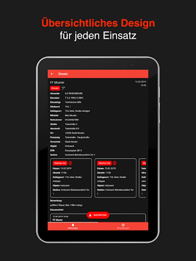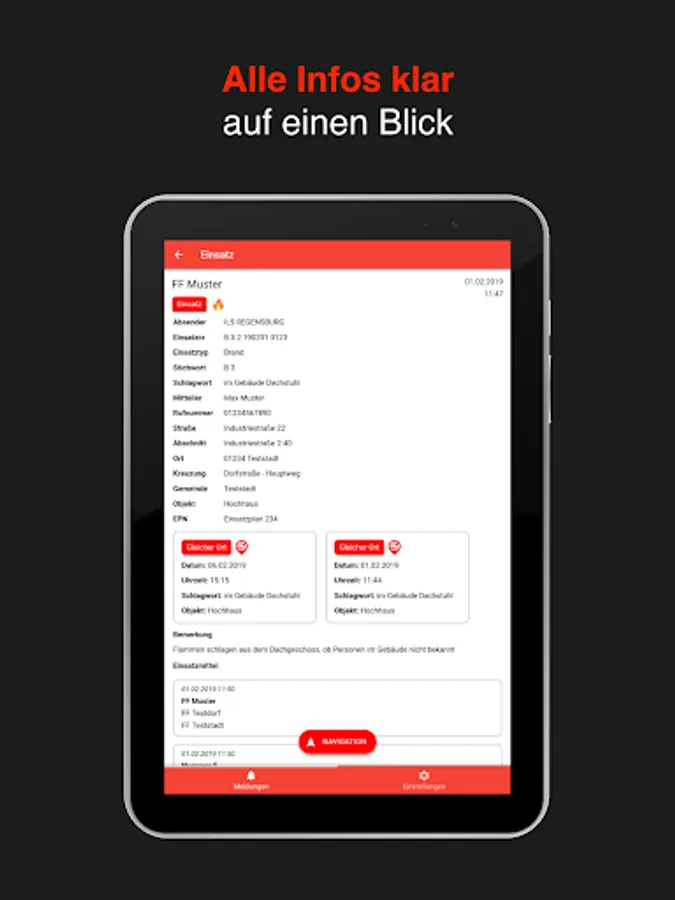 Alarms are usually triggered directly by the dispatch control system or via the automatic evaluation of POCSAG, e-mail, FAX, telephone call or SMS. Inserts can also be triggered manually via the app or browser interface.