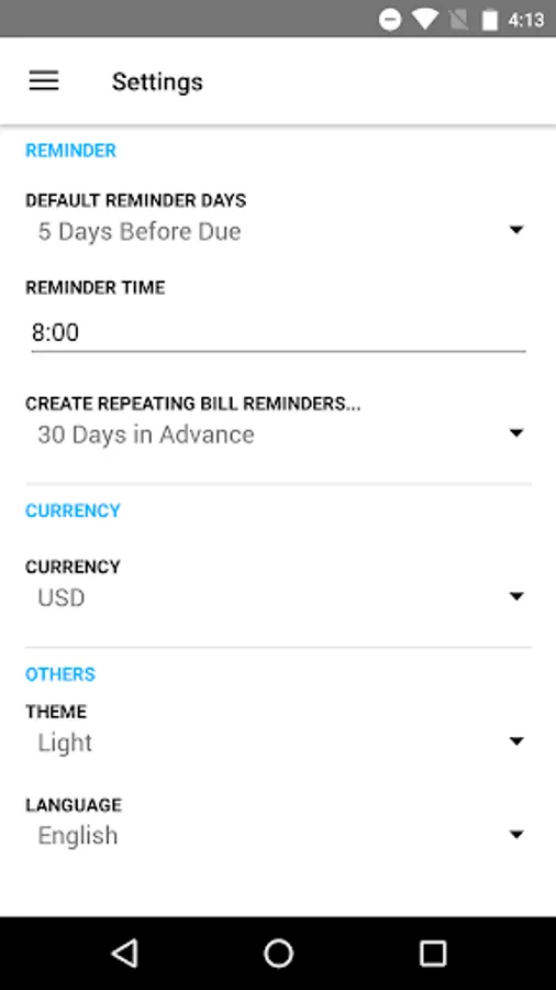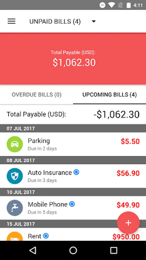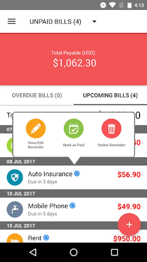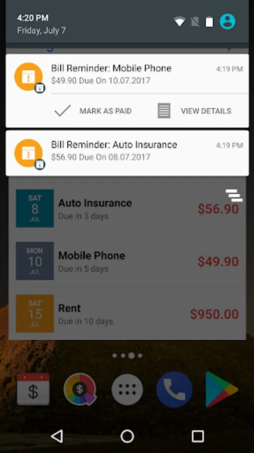 -Unlike other bill tracking apps, Bills Reminders will always fire off when the bill payment is coming due, no matter whether you have opened the app or not or whether you have rebooted your device.