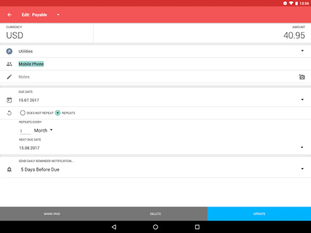 -You can also setup recurring bill reminders. The repeating period is extremely flexible, you can set bill reminders to repeat every X days,weeks,months or year. (Eg. every 2 weeks, every 6 days, every 1 month etc.)
