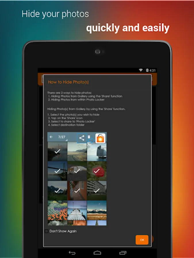 2)User friendly operation - Easily hide photos via default gallery or from within Photo Locker itself.