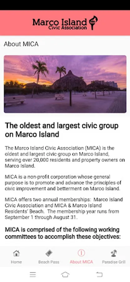 MICA offers two annual memberships: Marco Island Civic Association and MICA & Marco Island Residents’ Beach. The membership year runs from September 1 through August 31.