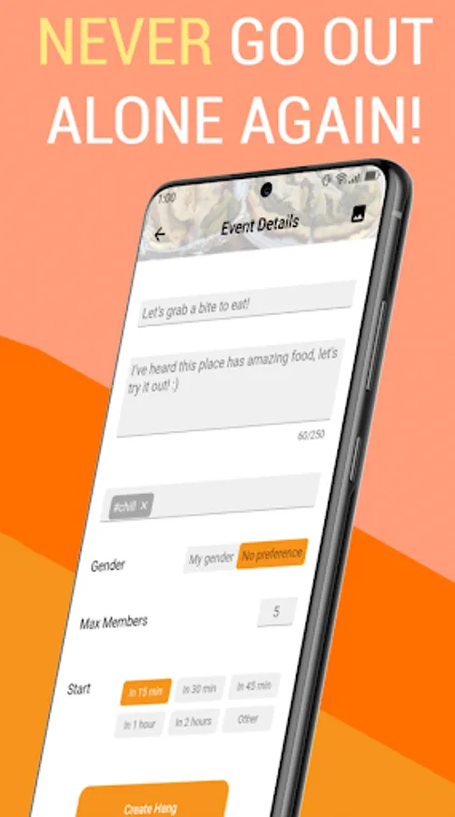 You love going out. Why should you have to deal with the hassle of finding people to go with and planning around their schedule? Just list your outing as a βHangβ and nearby users can join in right now!