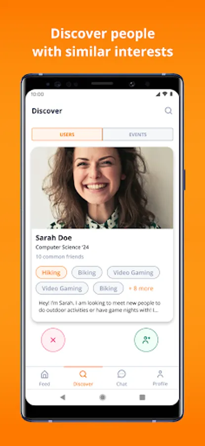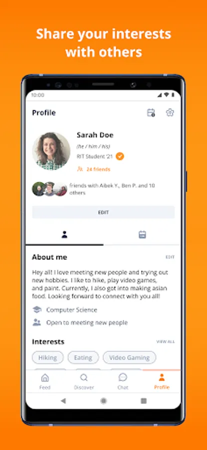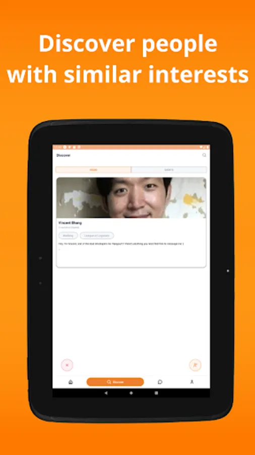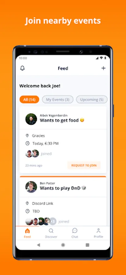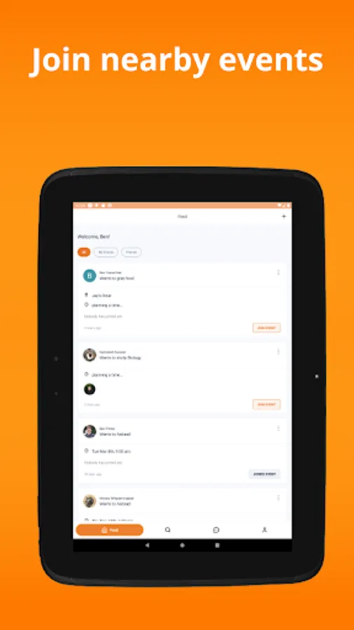 Whenever you want to plan an event, simply post it on the feed and easily tag activities and friends you want to hang out with. Hangout will match you with your friends that might be available, or connect you with new people nearby if your friends are busy.