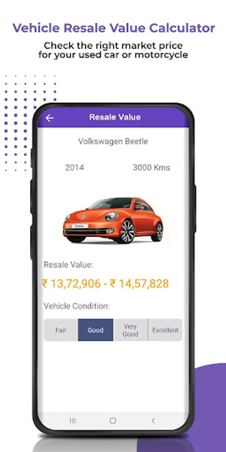Our Resale Value calculator enables you to check the right market price for your used car or motorcycle. It takes in various parameters such as Vehicle Maker, Model, Year and kms driven by the vehicle to give you the fair price for your vehicle.