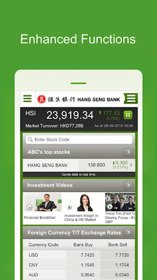 Up-to-date market information and latest market outlook are requisite for you to make the best investment decision. Hang Seng’s Market Info App with enhanced functions helps you to seize each investment opportunities. Download Now to experience our comprehensive market info app!