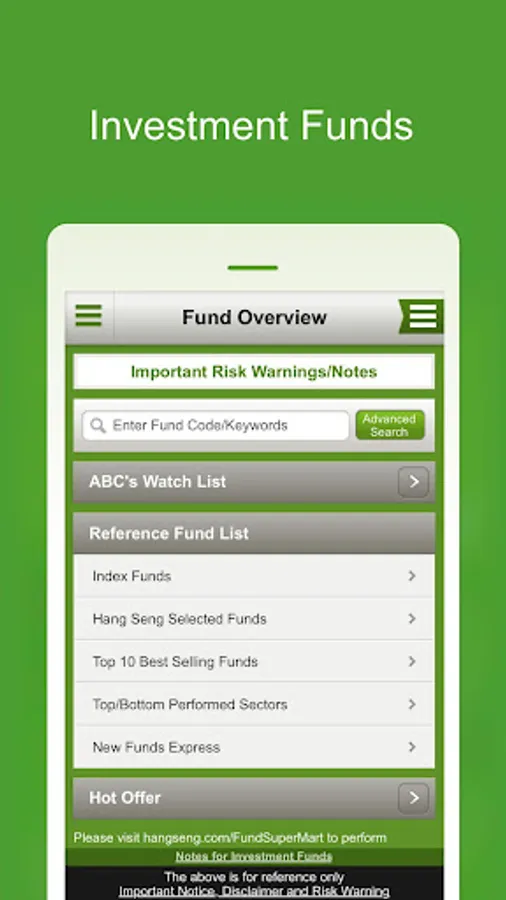 All information and services provided herein are solely for personal and non-commercial use and for general information and reference only. Re-distribution of any part by any means is strictly prohibited. The information provided in this App, including but not limited to general financial and market information, news services and market analysis prepared and/or issued by persons other than the Bank and/ or the Bank (together “Market Information”) contained herein does not intend to and should not be regarded as an offer or solicitation or recommendation to buy or sell any investment products. The information contained herein is for general information and reference purposes only and is not intended to provide professional investment or other advice. It is not intended to form the basis of any investment decision. Persons accessing this App should not make any investment decision based solely on the information and services provided herein. Before making any investment decision, persons accessing this App should take into account his/her own circumstances including but not limited to his/her financial situation, investment experience and investment objectives, and should understand the nature, terms and risks of the relevant investment products. Persons accessing this App should obtain appropriate professional advice where necessary. Hang Seng does not guarantee the accuracy and reliability of the Third Party Information and Market Information provided herein and accepts no liability (whether in tort or contract or otherwise) for any loss or damage arising from any inaccuracies or omission.